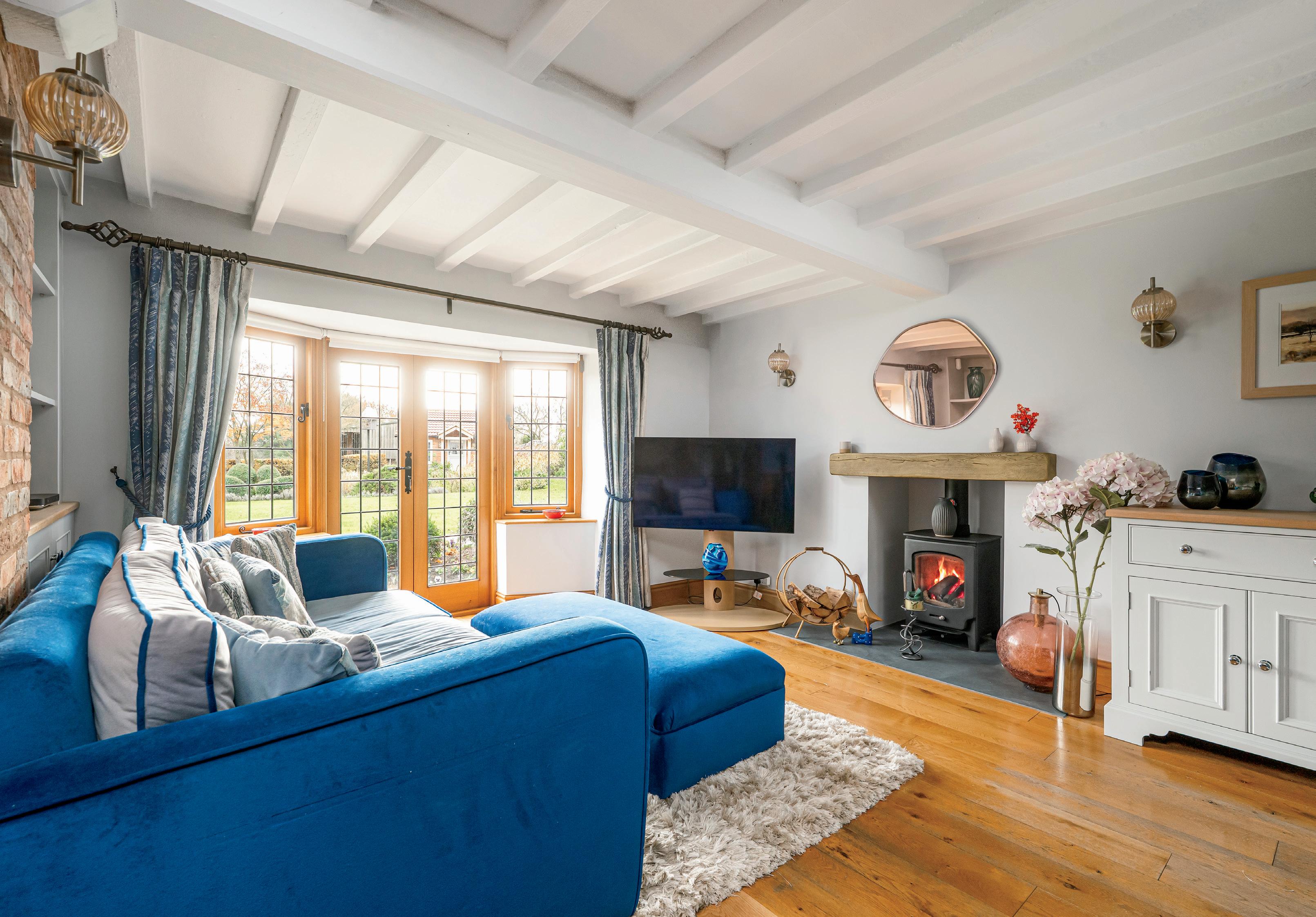 Flowing seamlessly from the kitchen are a series of impressive reception rooms designed for both relaxation and entertaining. The dining room and sitting room each feature striking bay windows and French doors opening onto the formal gardens, flooding the interiors with light and countryside views. Oak flooring, painted ceiling timbers and a magnificent stone fireplace add warmth and charm, while the adjoining pool and leisure suite offers a more contemporary setting for recreation and wellness.