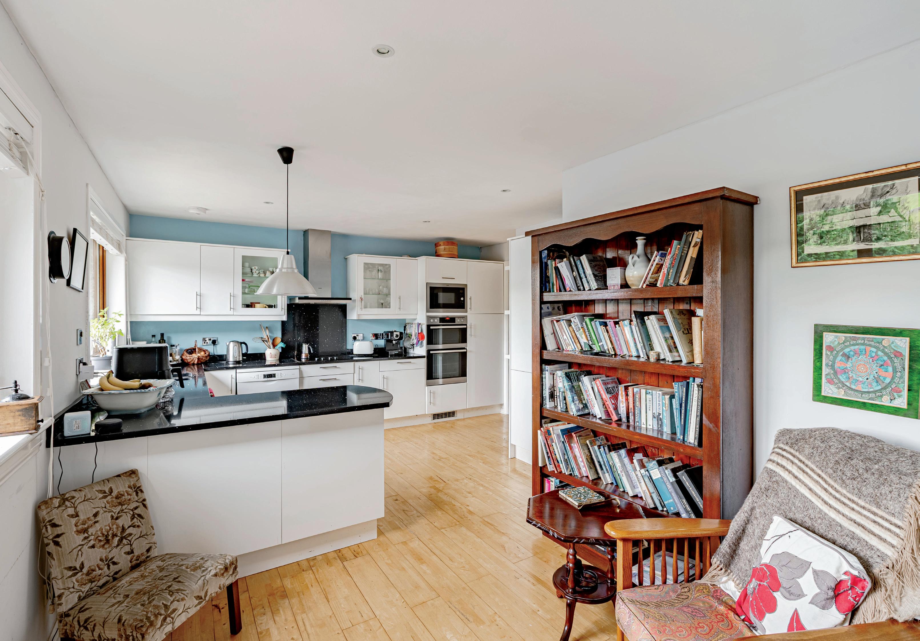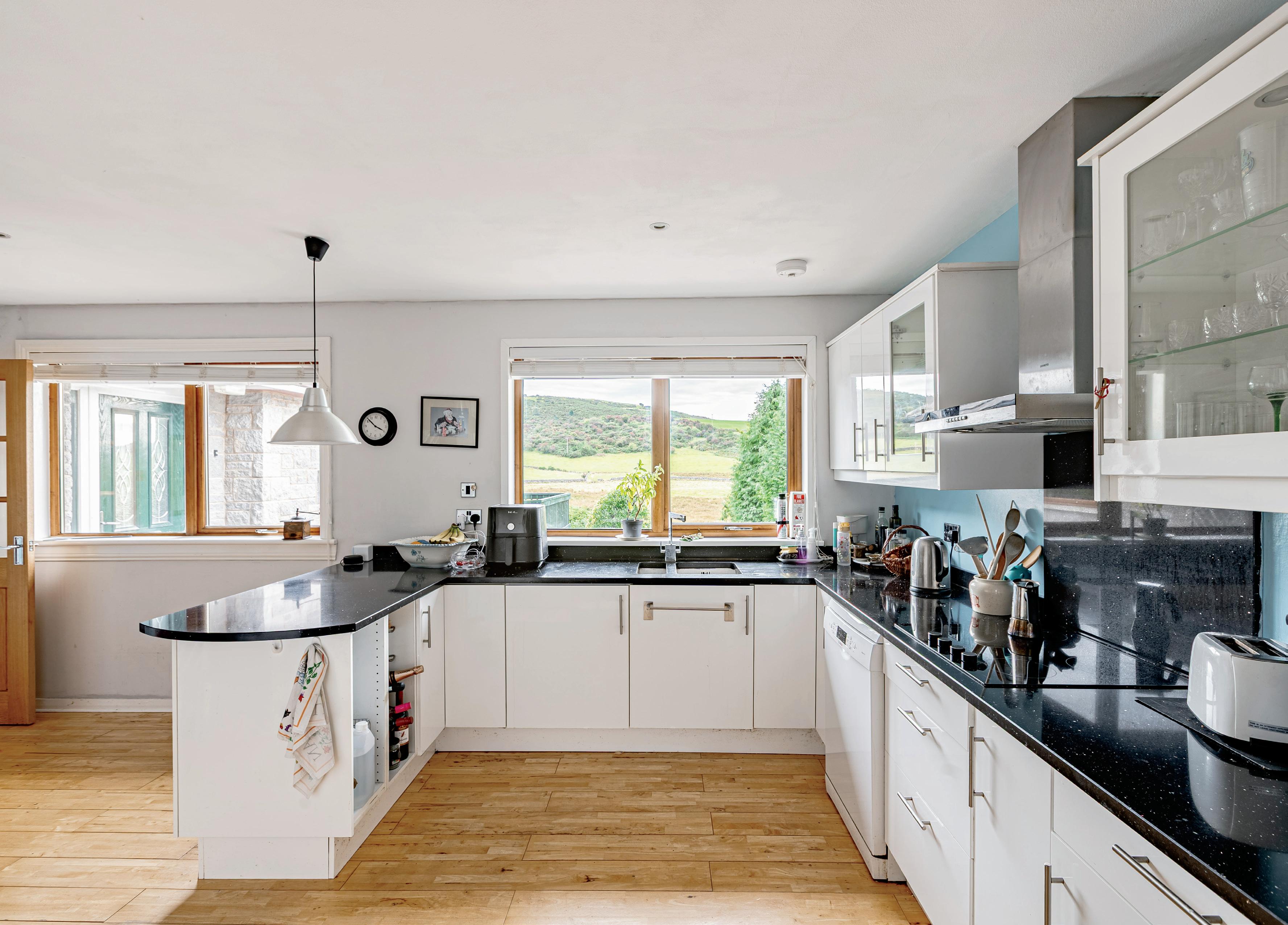 The sunny kitchen/breakfast room boasts two large windows to the front elevation, lovely views and an attractive solid wood floor. There is an excellent range of white gloss units with granite worksurfaces and a breakfast bar, 1 ½ bowl sink with mixer tap and integrated appliances include a microwave, double oven, electric hob with extractor hood over, fridge freezer and an additional full freezer.