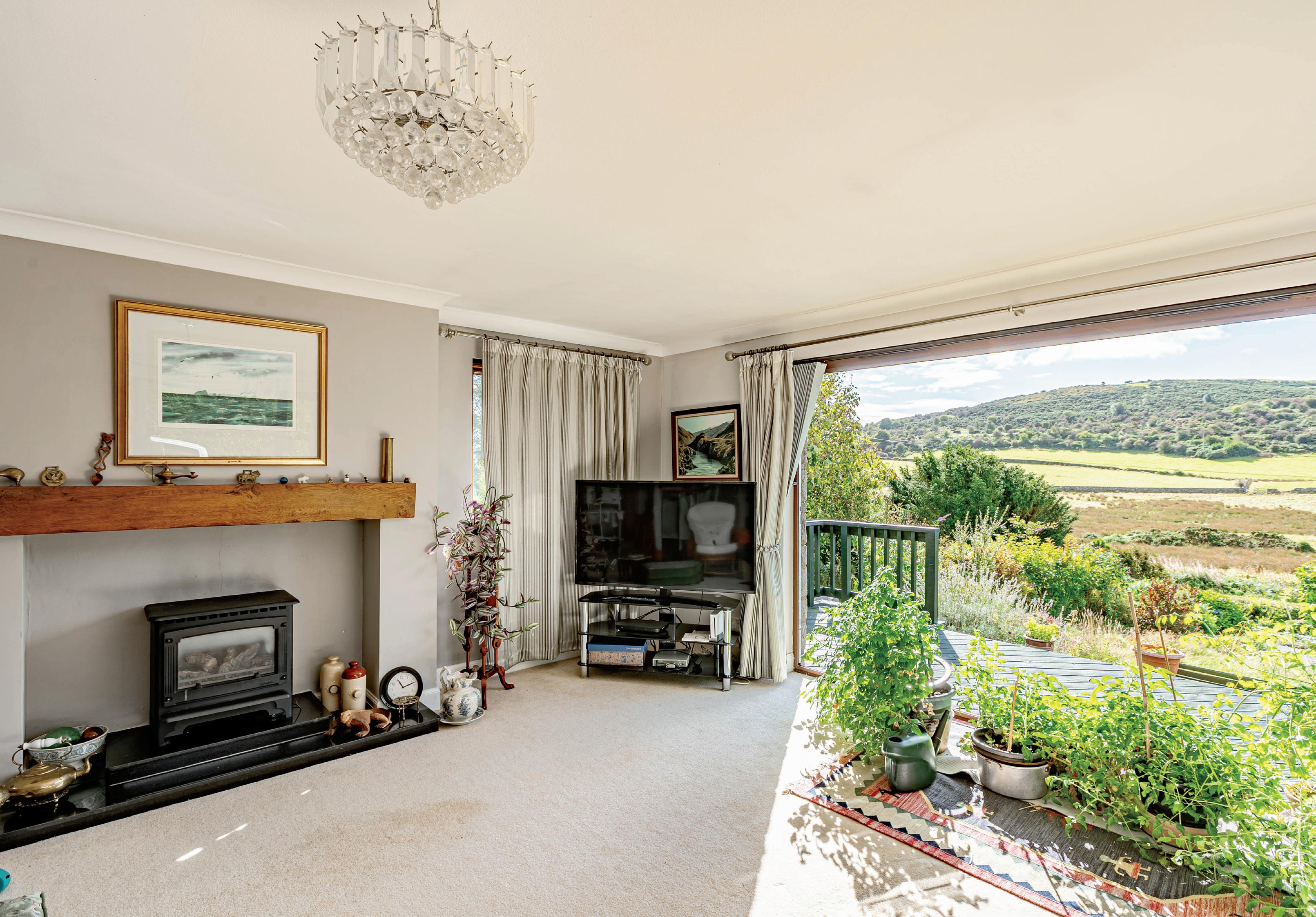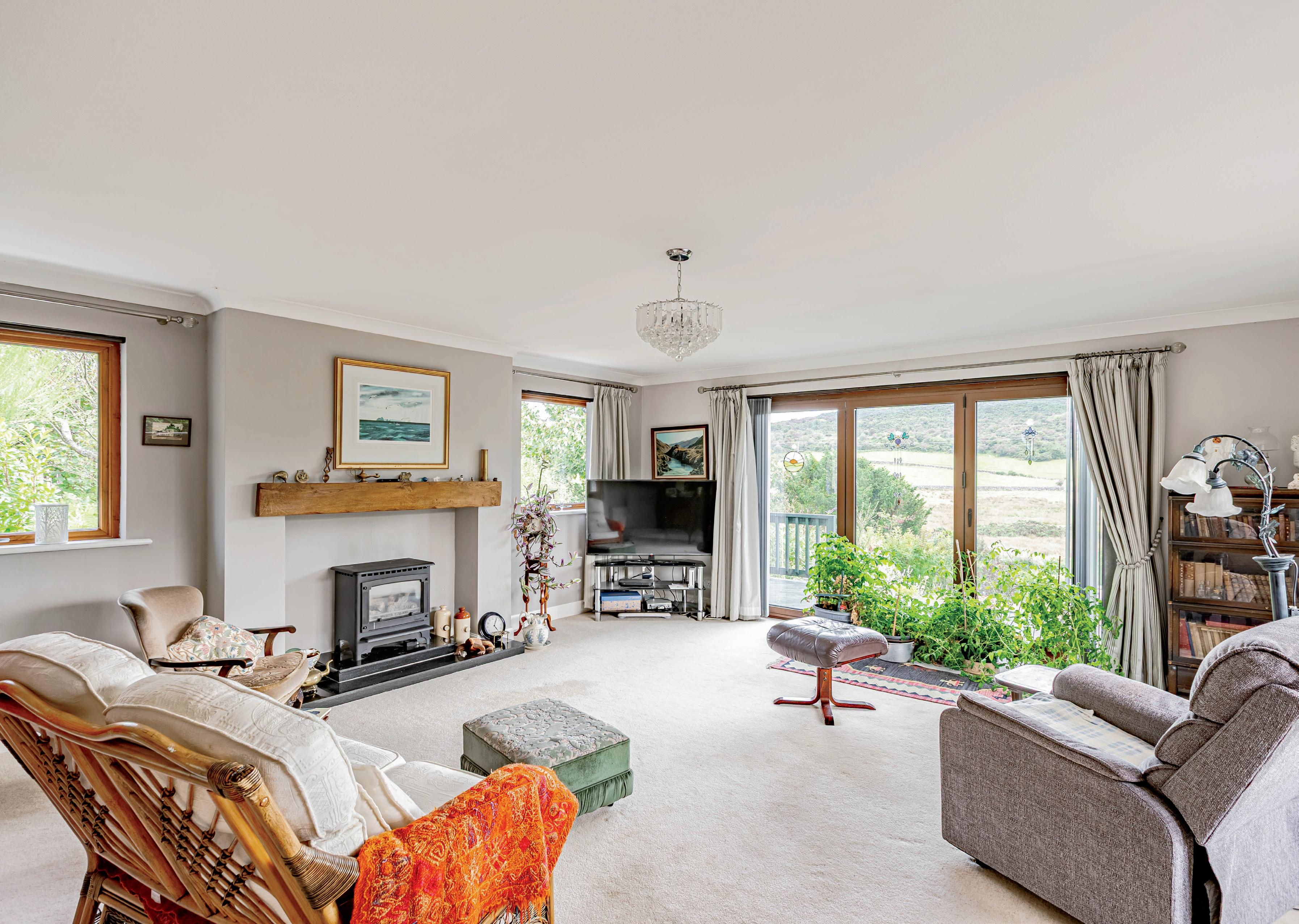 The sitting room is located to the front of the property, flooded with natural light and enjoys a triple aspect, with attractive views over the surrounding hills. Bi-fold doors open out to the raised decking area and gives access to the front garden. There is a gas log effect fire set on a granite hearth. To the rear of the sitting room is the open plan dining room, which has a window to the side elevation and a deep walk-in cupboard.