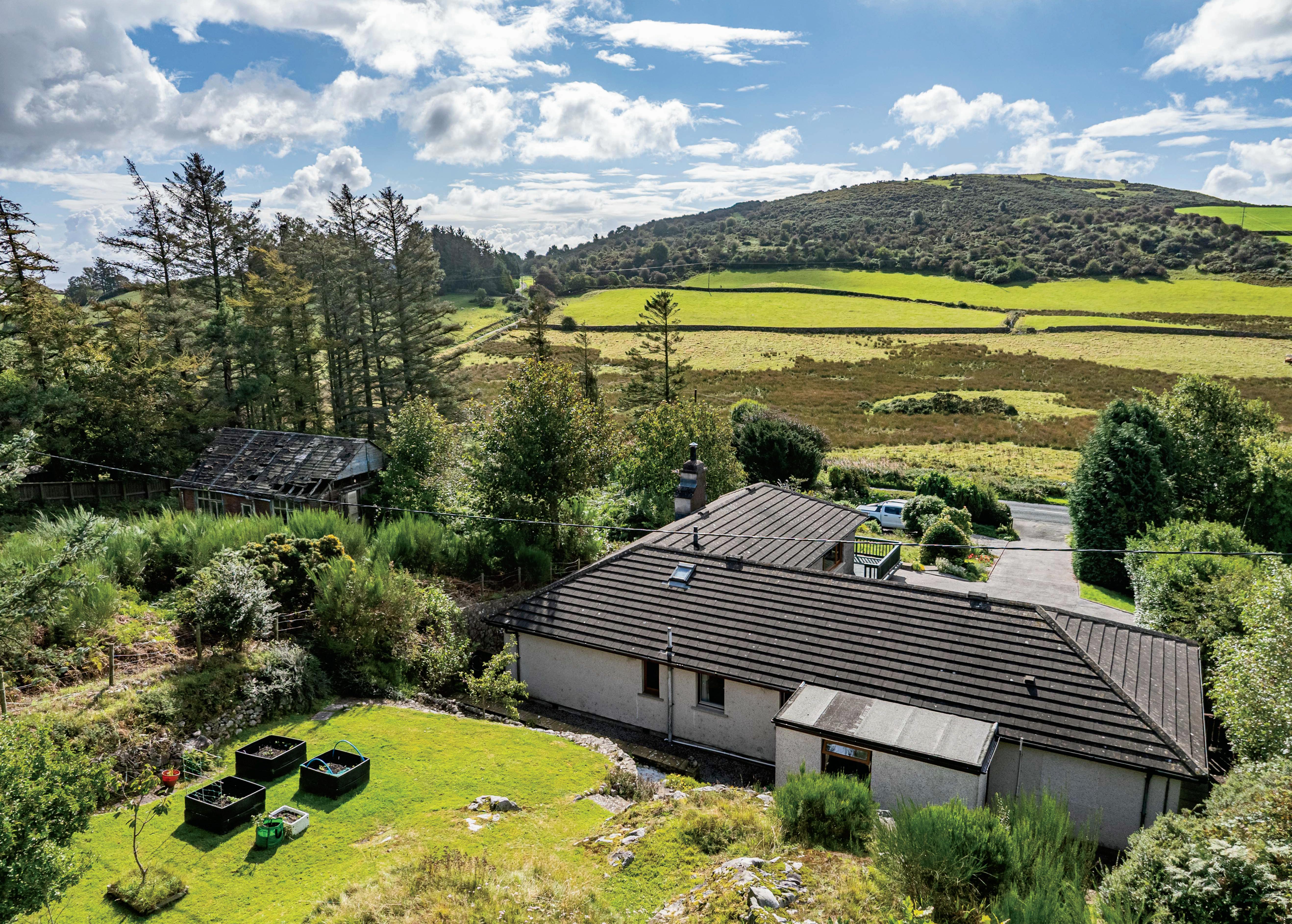 Set back from the road in an elevated position, the property is accessed via a tarmac driveway, offering ample parking and turning, and culminating at the garage and front door. There is additional parking in a gravelled area to the right-hand side of the driveway entrance too.