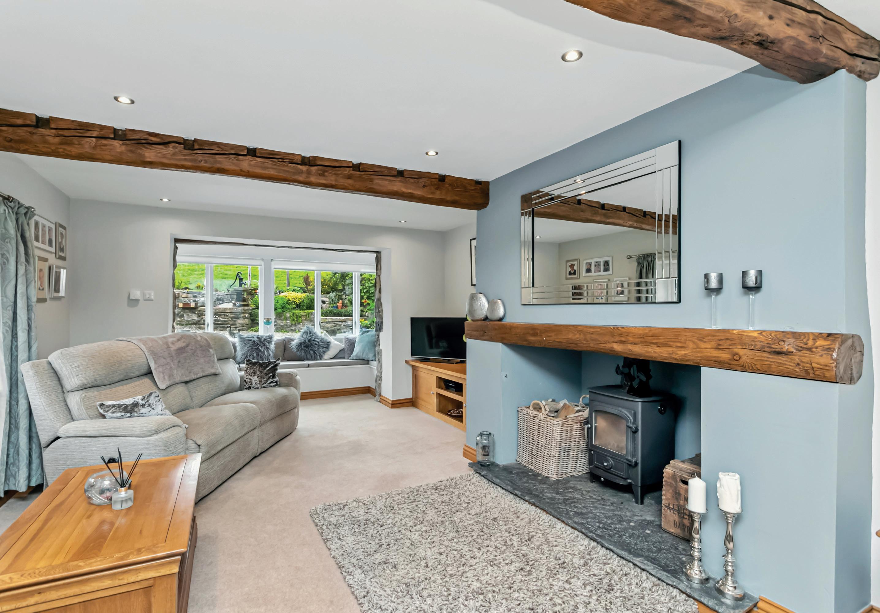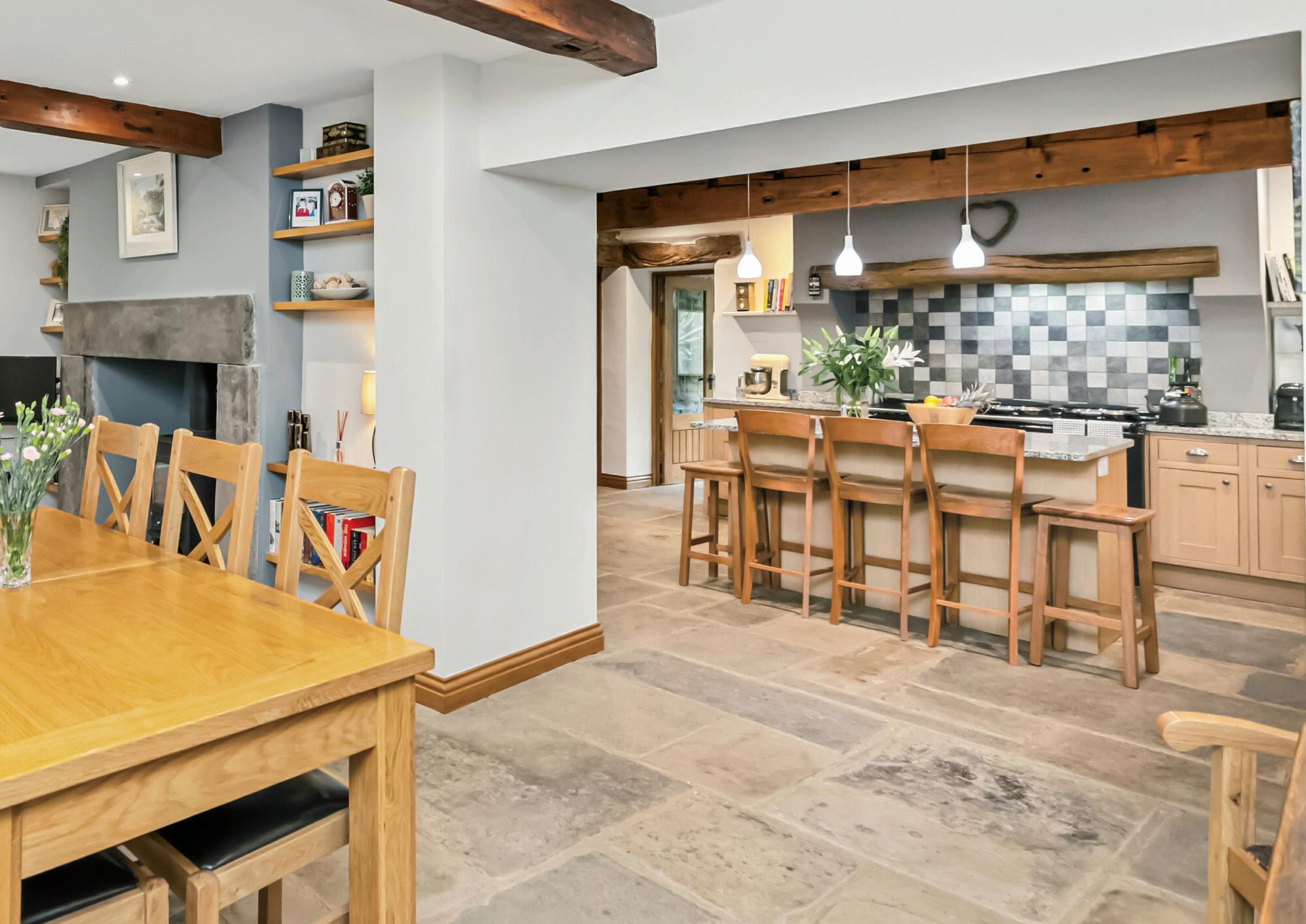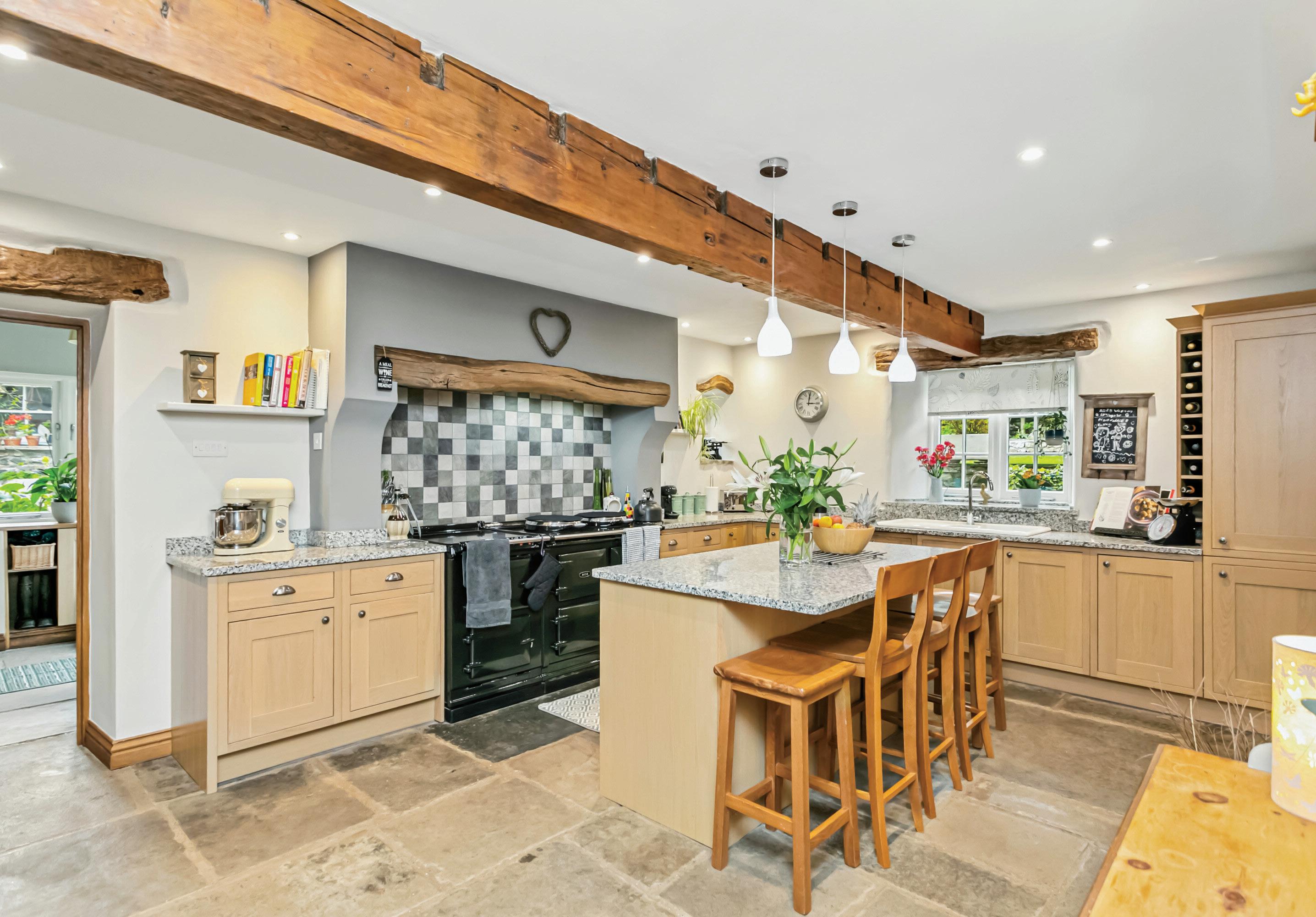 The house is spacious and characterful with an inviting nature that lends itself perfectly to family life and will appeal to those who enjoy entertaining at home. An impressive entrance through the arched front door leads into the roomy hall, a great circulation space when welcoming guests. No wonder the family choose this room for their Christmas tree. Off the hall is an inner cloakroom with space for coats and a fitted bench with hidden storage for logs and firewood, through into a downstairs WC. The sitting room is a large room with a wide and deep square bay offering space to sit and enjoy the delightful views. The heart of a country home, the kitchen is open to the dining area and snug creating a living kitchen that is sure to be a well-used family space and great for entertaining a crowd with plenty of room to spread out. The various areas are united by big old original York stone flags, with underfloor heating and an electric Aga that ticks over during the day until needed for cooking so generating a warmth which permeates through the house. Traditional cabinets with light oak doors and granite worktops are a timeless choice and include an island which extends into a breakfast bar. The snug has ample space for comfy seating in front of the stove and French doors to the garden. Completing the ground floor is a separate pantry, utility room, rear porch and a second cloakroom, handy for when out in the garden.