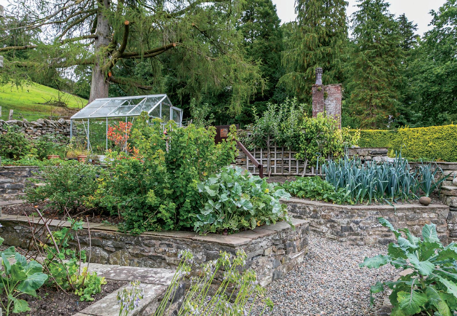 At the highest level of the garden, the greenhouse also occupies a sunny spot and has a tremendous view as do the adjacent raised vegetable beds. There’s a selection of fruit trees, including apple, pear, cherry and plum.
