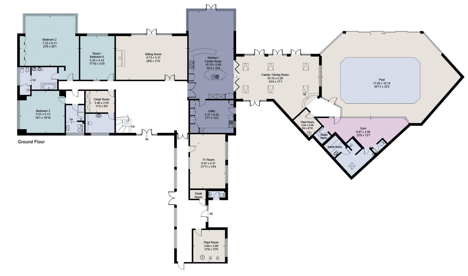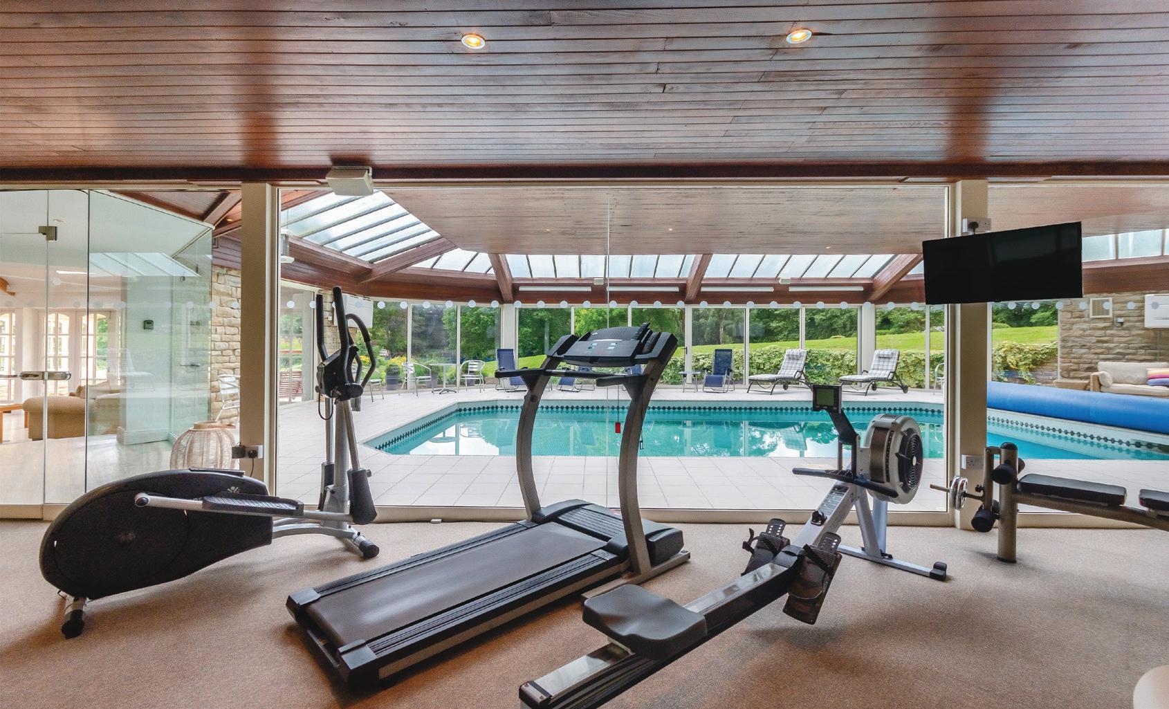 Overlooking the pool through a feature glazed internal wall is the home gym, the changing room, sauna, steam room, shower room and WC. This area of the house also provides the plant room housing boiler and filtration system.