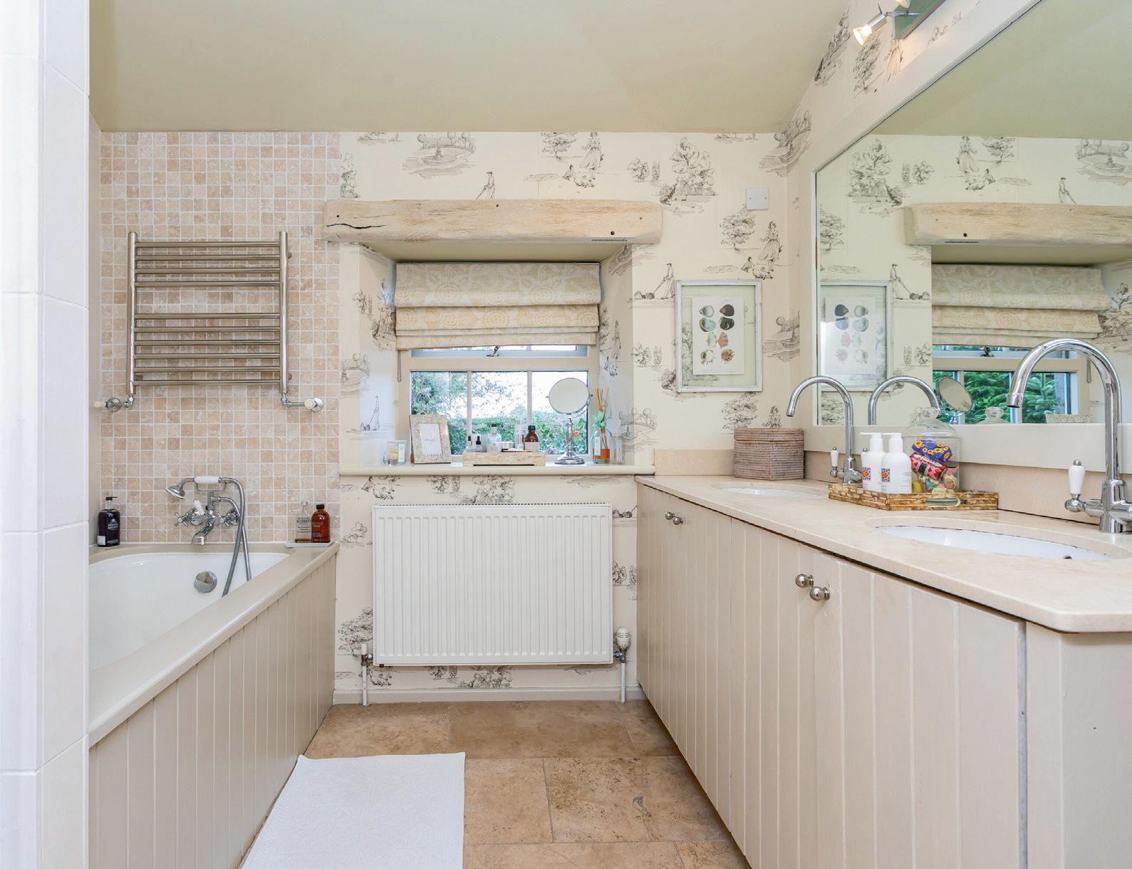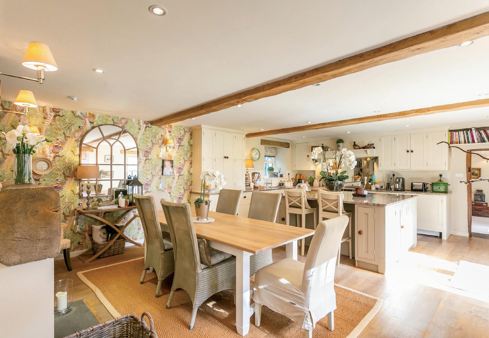 Stepping inside, a welcoming reception hallway sets the tone, with exposed timber panelling, striking trusses, and a stone-flagged floor leading into an exquisite sequence of inviting living spaces. The day room, with its beamed ceiling and dressed stone fireplace, flows effortlessly into a spacious sitting room, where a log-burning stove is nestled within a beautifully crafted brick hearth. The farmhouse kitchen is a showpiece of bespoke carpentry, featuring hand-painted cabinetry, solid marble work surfaces, and a central island, all complemented by a Falcon range oven and French doors that open onto the gardens. A stunning garden room, bathed in natural light, extends the living space, framed by stone mullioned windows and a vaulted ceiling, with direct access to a sun-drenched patio. Off the hallway, a stylish two-piece cloakroom and a highly practical utility room complete the ground floor accommodation.