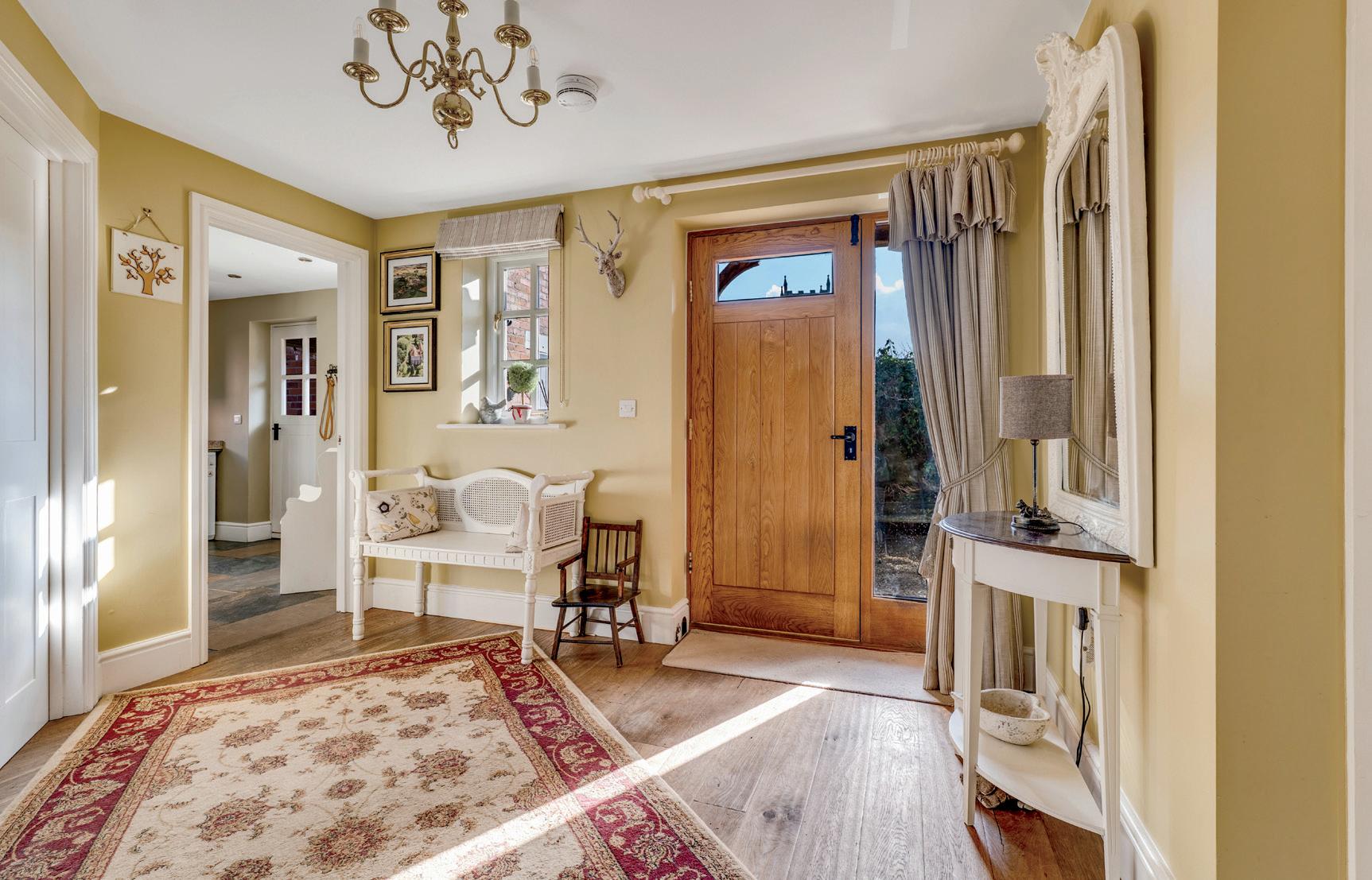 The adjacent utility/boot room provides generous storage with fitted cupboards, a dedicated space for a washing machine and tumble dryer. Thoughtfully designed for everyday convenience, it also offers access to a guest cloakroom and a canopied side entrance—ideal for busy family life or returning from countryside walks with the dog.