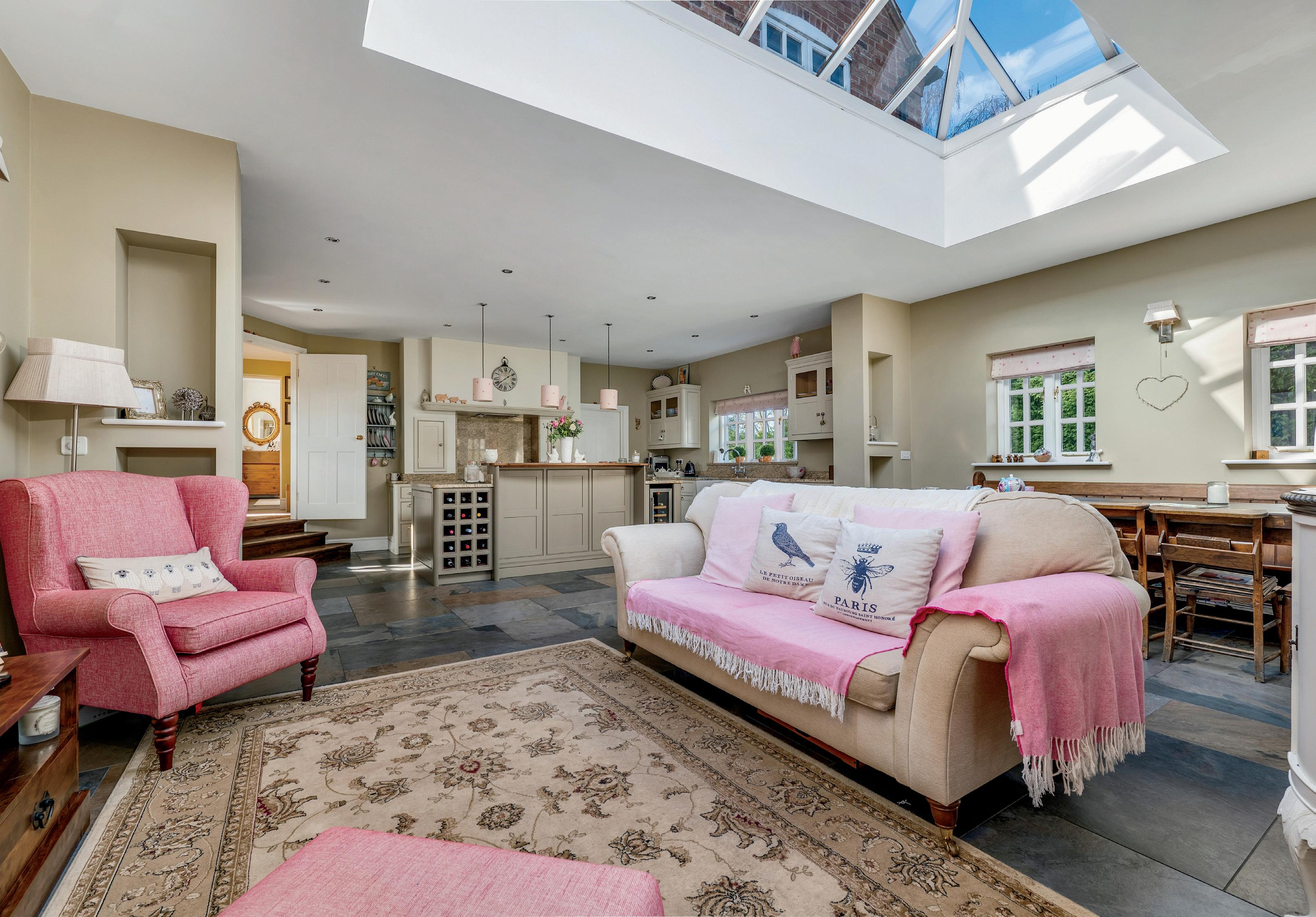 Flowing effortlessly from the dining room, the home’s original entrance hallway reveals a second staircase adding to this homes versatility and leads to the cozy sitting room and a versatile study/family room. Both spaces enjoy natural light from their dual-aspect windows and showcase characterful fireplaces with wood-burning stoves, offering a perfect blend of warmth, comfort and charm.