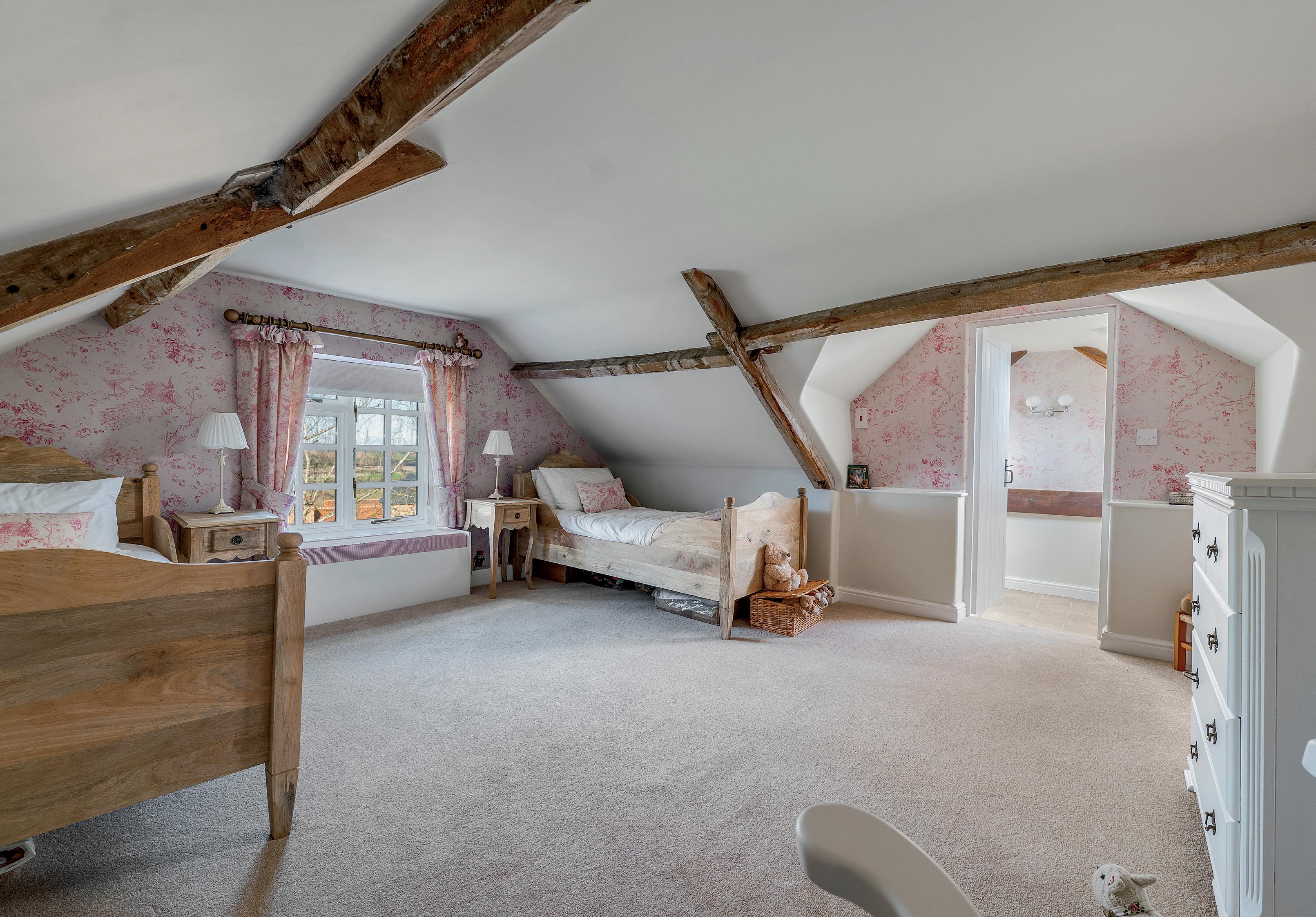 The second floor opens onto a charming landing, leading to two characterful attic bedrooms, each brimming with original charm and exposed feature timber purlins. One of the bedrooms benefits from a beautifully appointed ensuite, adding a touch of luxury to this unique and inviting space.