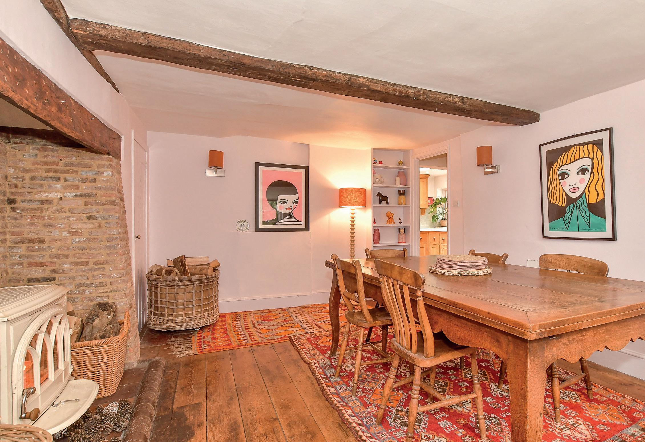 The property is approached through wood gates that lead to a gravel parking area, a garage and an oak framed porch with Kent peg tile roof that is used as the main access. This leads to a cloakroom and utility area and through to the traditional kitchen with terracotta floor tiles, a lantern skylight, an Aga and bespoke wood units with polished concrete worktops and stand-alone appliances. There is a step up to a large breakfast area with an exposed beam and a door to the wonderful dining room. Friends and family will be delighted to enjoy a meal in this very characterful room with original wood floors, access to a small cellar and a vast inglenook fireplace with a large Bressumer beam.
