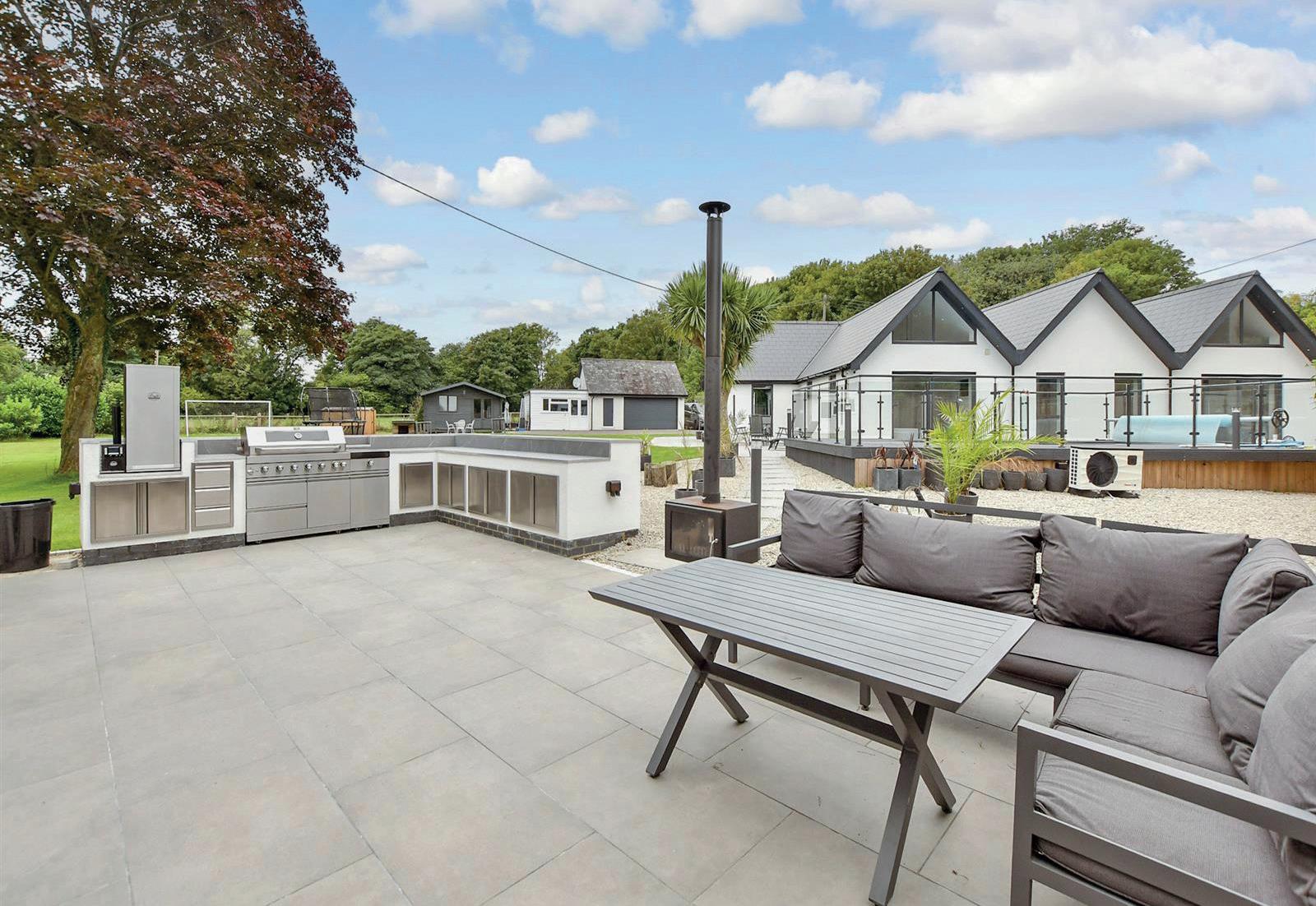 A white limestone patio interspersed with paving slabs leads to the external entertainment area with its porcelain terrace and amazing stainless steel outdoor kitchen with porcelain work tops and full power. There is a smoker, a Draco barbecue grill and additional cooking facilities. There is a superb insulated cabin with two sets of patio doors to the terrace, a pine interior, a large and well-equipped bar with a fridge and a spacious seating area as well as radiators, a log burner and intelligent lighting.
