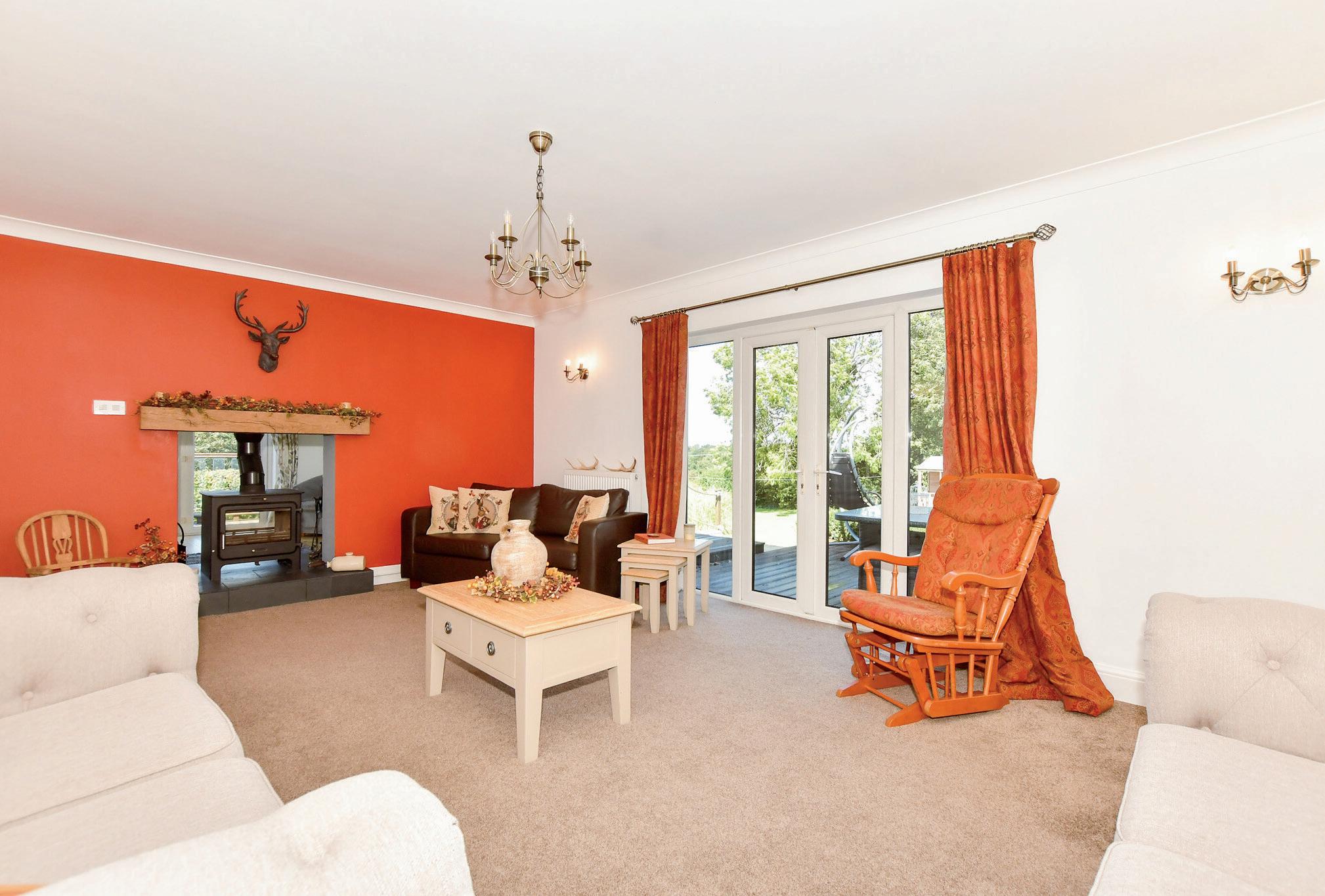 There is also a utility room with stand-alone appliances and the inner hallway with storage facilities leads to the ‘heart of the home’ – the stunning light and bright open plan family space. This includes a superb dual aspect vaulted ceiling kitchen/breakfast/living room with painted cross beams, engineered oak flooring, three bi-fold doors to the wraparound decked terrace and a two-way log burner in the seating area that also heats to the adjacent sitting room. The kitchen includes plenty of attractive flat fronted cream units with solid wood worktops housing an induction hob, two fan ovens, a combi microwave, an integral dishwasher and drinks fridge with space for an American style fridge freezer. A pair of doors open directly into the superb dining room with tiled flooring where you can happily entertain numerous guests. To continue the free flowing feel there are double doors into the charming sitting room that also benefits from the log burner and has French doors to the decked terrace with its glass and wood balustrade.