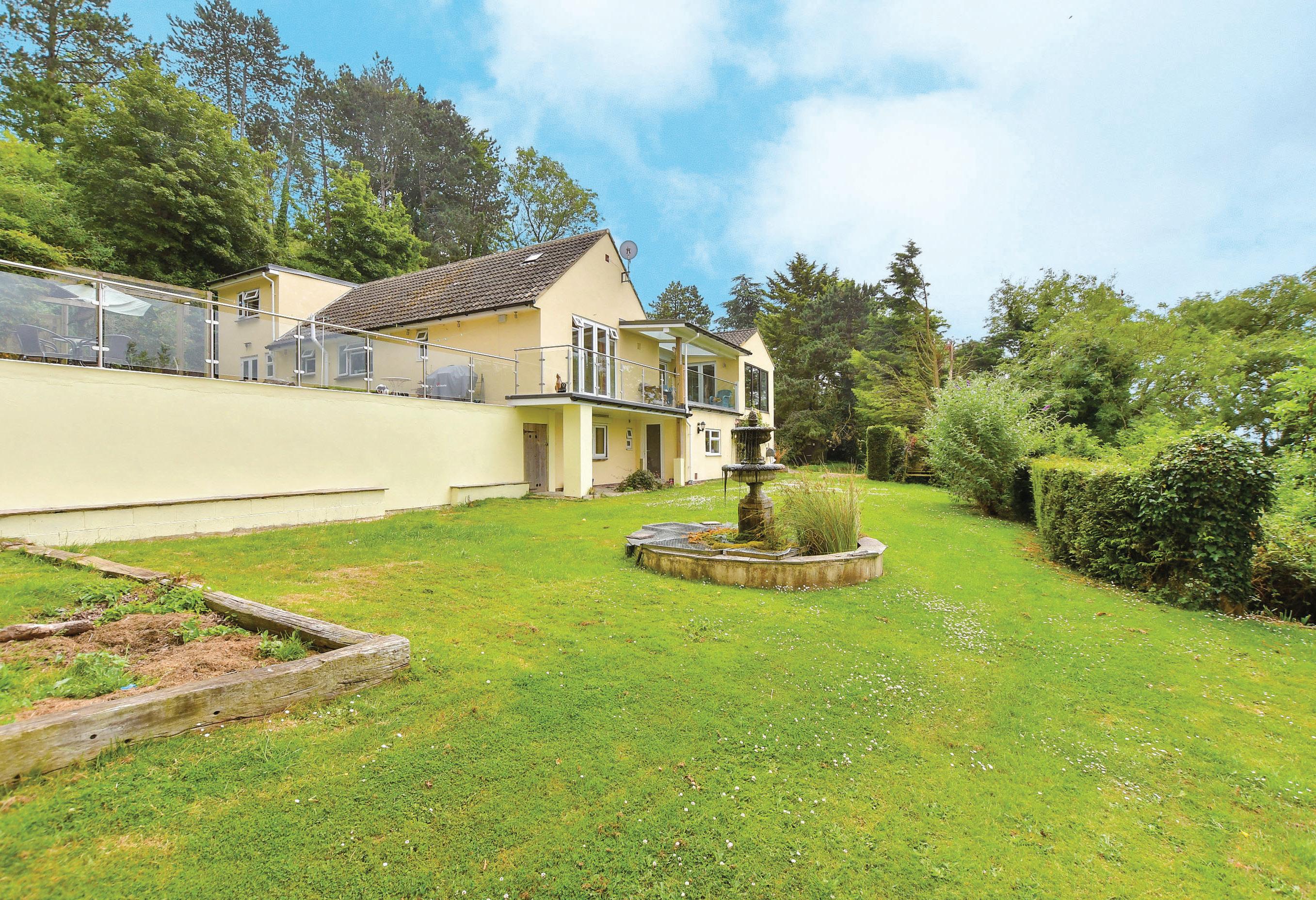 Outside the large upper terrace includes a charming octagonal wood framed gazebo for al fresco dining. There is also an aviary for the peacocks, a grassy area and a patio with a backdrop of impressive mature trees and shrubs while the lower garden incorporates the covered veranda style terrace with garden storage sheds, a large lawn with a circular fishpond and fountain as well as a high hedge, a children’s play area and access to sloping pastureland and woodland.