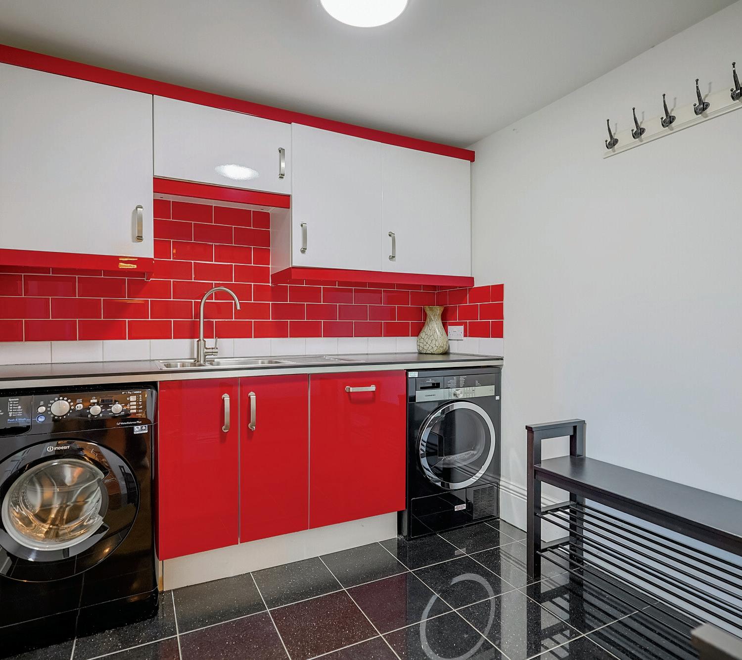 Off the study lies the very useful utility/laundry room, providing additional wall and base units, a double stainless-steel sink with drainage, tiled flooring with underfloor heating, and space for two under-counter appliances. A door gives direct access to the outside.