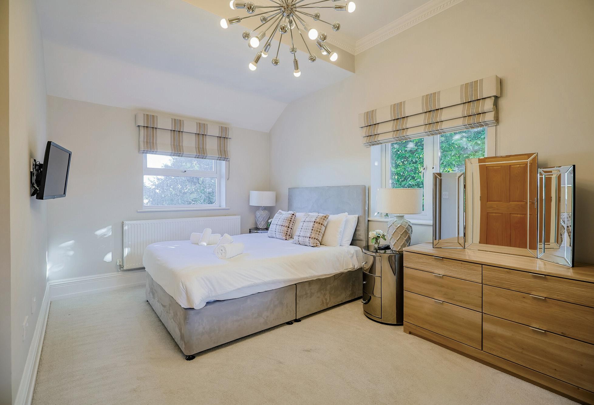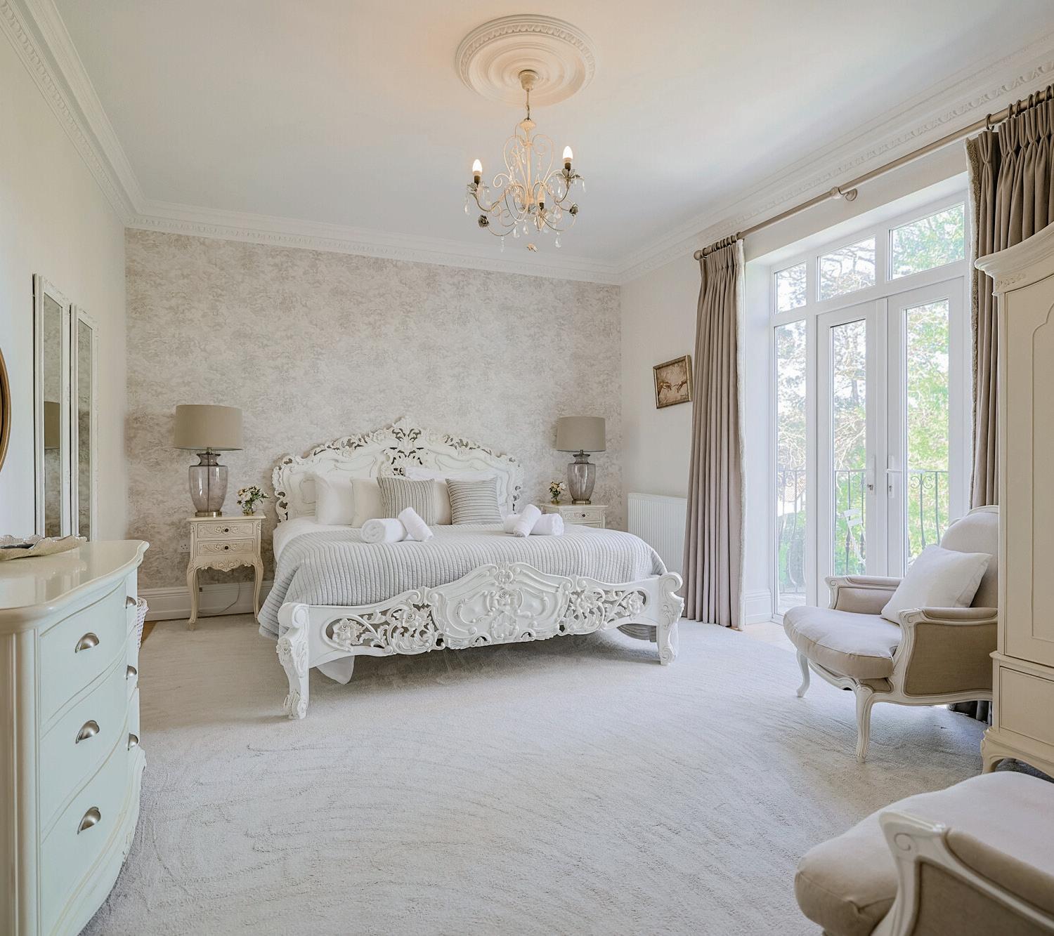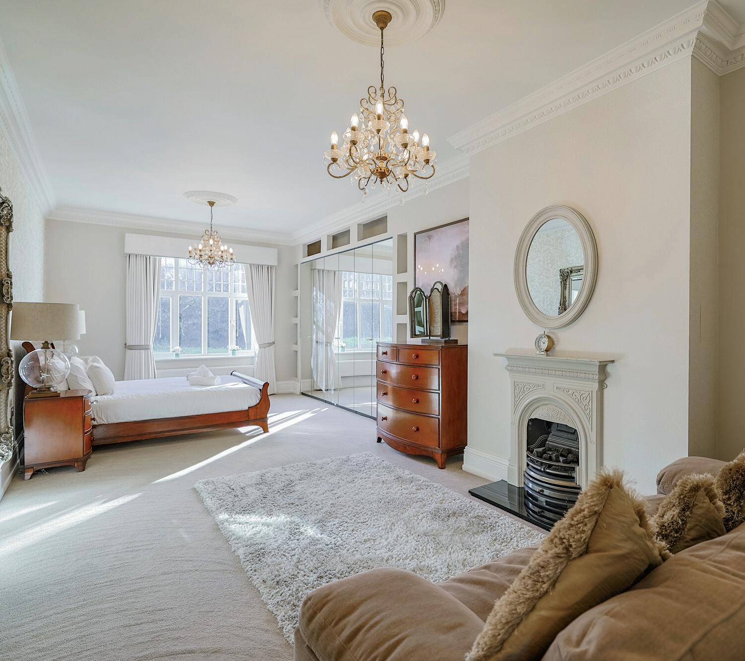 A substantial and beautifully presented bedroom laid with carpet, where a large rear window overlooks the generous grounds. A feature fireplace, high ceilings with detailed coving and a ceiling rose add character, while an array of mirrored wardrobes with fitted shelving and hanging rails offers excellent storage. There is ample space for a seating or dressing area, depending on your needs.