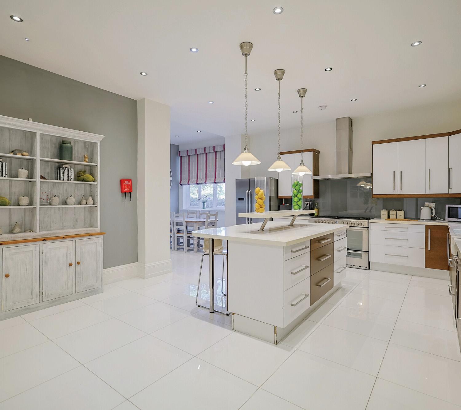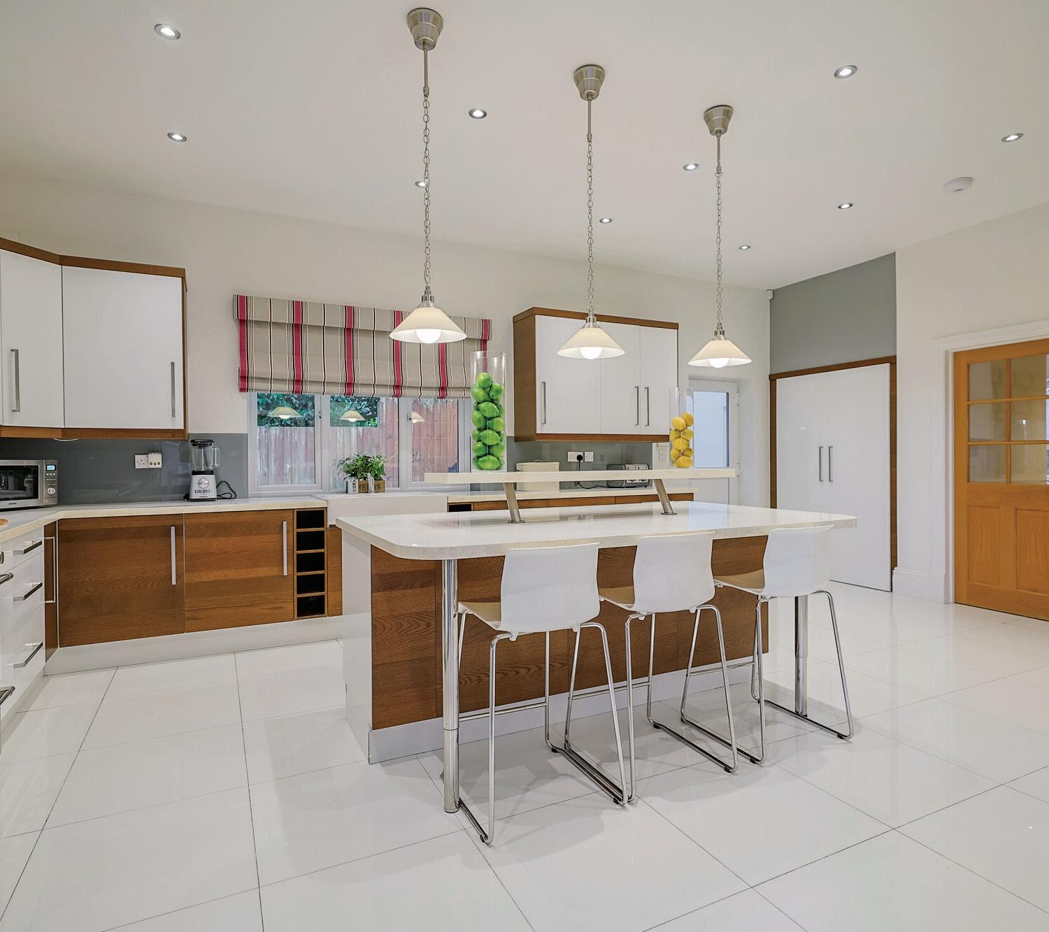 The modern kitchen/breakfast room boasts tiled flooring with underfloor heating, spot and feature lighting, a feature electric fireplace and dual-aspect windows. The kitchen is well equipped with a range of wall and base units, a double porcelain sink, integrated Smeg dishwasher, Stoves Sterling double oven, grill, warming drawer, and a 7-ring gas hob with an elevated extractor fan. There is a large kitchen island with extra storage and a breakfast bar for three stools, and space for an American-style fridge/freezer. Ample space remains for a breakfast table or seating area, an ideal family zone. From here, you have access to the study, the secondary stairway, the boiler room and the rear garden.