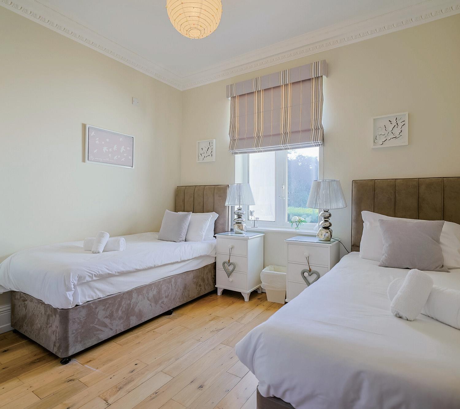 The impressive principal bedroom is laid with oak flooring and features high ceilings with detailed coving and a ceiling rose. Double doors, flanked by windows, open out onto a private balcony overlooking the grounds. This naturally bright space is complemented by a private en-suite, furnished with a WC, wash basin, walk-in shower, heated towel rail, tiled flooring, tiled walls, spotlighting, extractor fan and a frosted window.