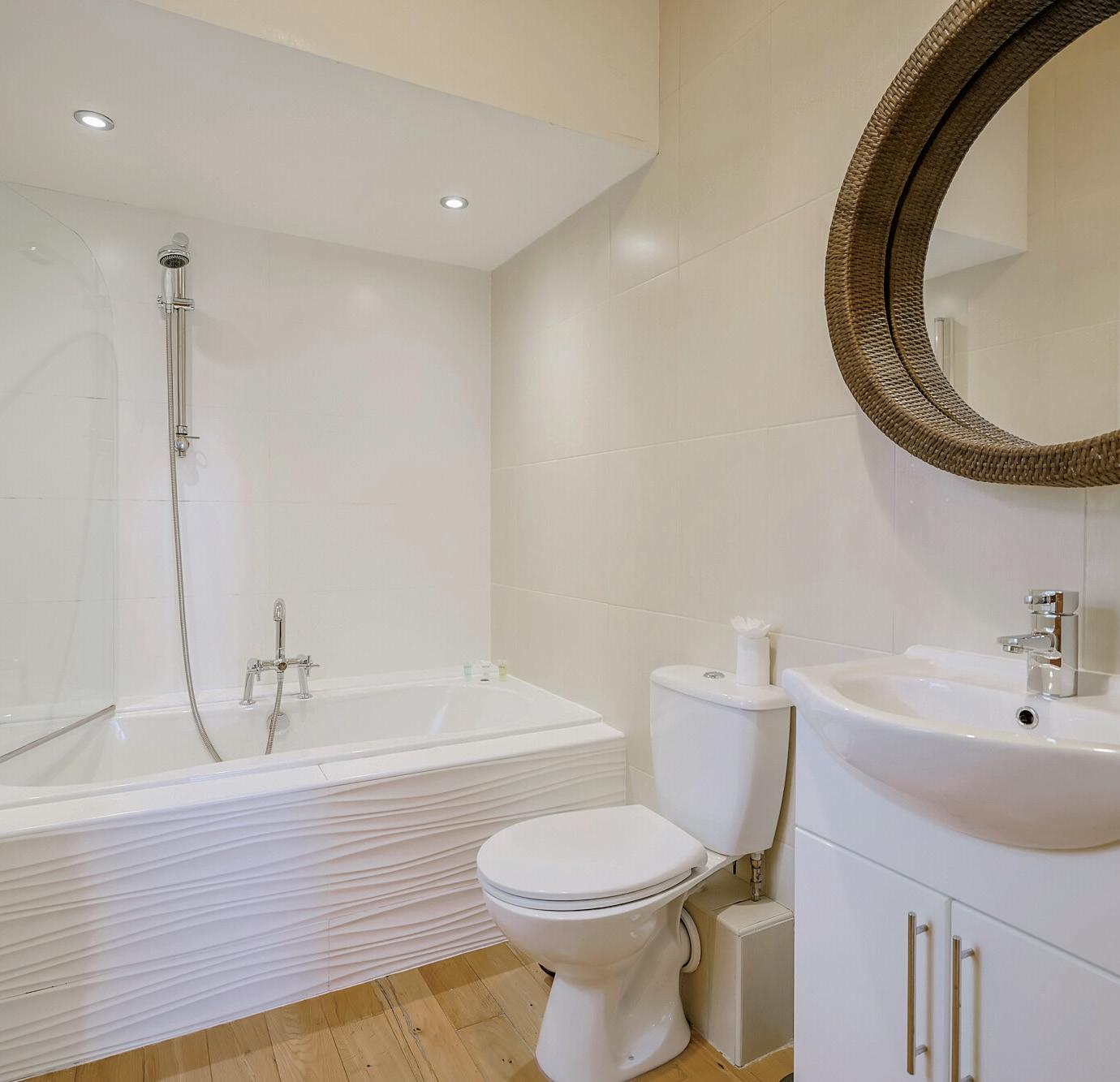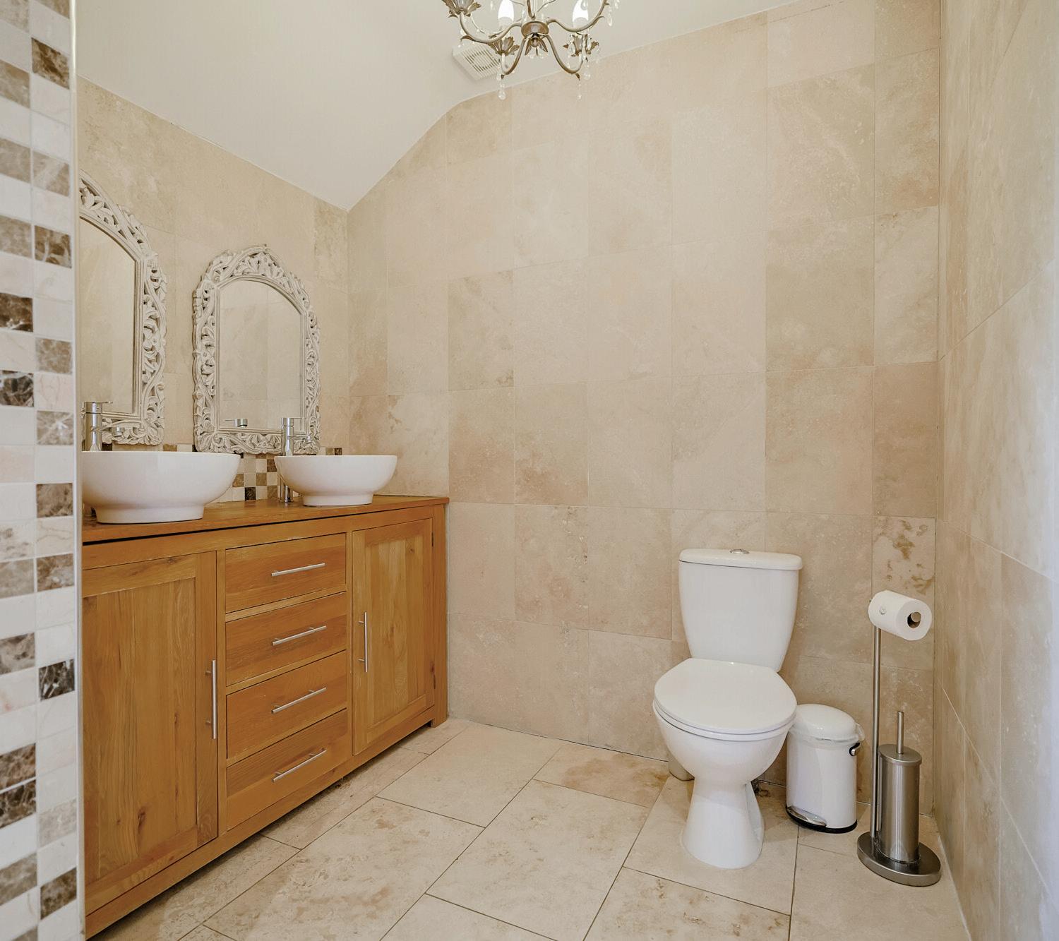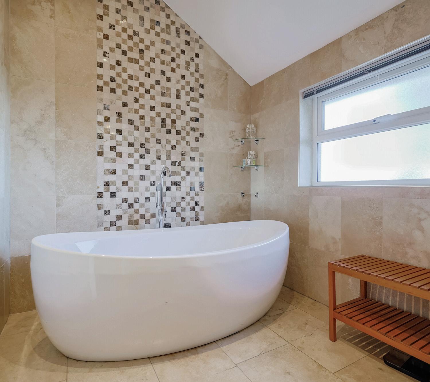 The family bathroom is furnished with a WC, twin wash basins with storage beneath, a feature bath with freestanding tap and handheld shower head, spotlighting, extractor fan, heated towel rail, tiled flooring and tiled walls, as well as a frosted rear window.