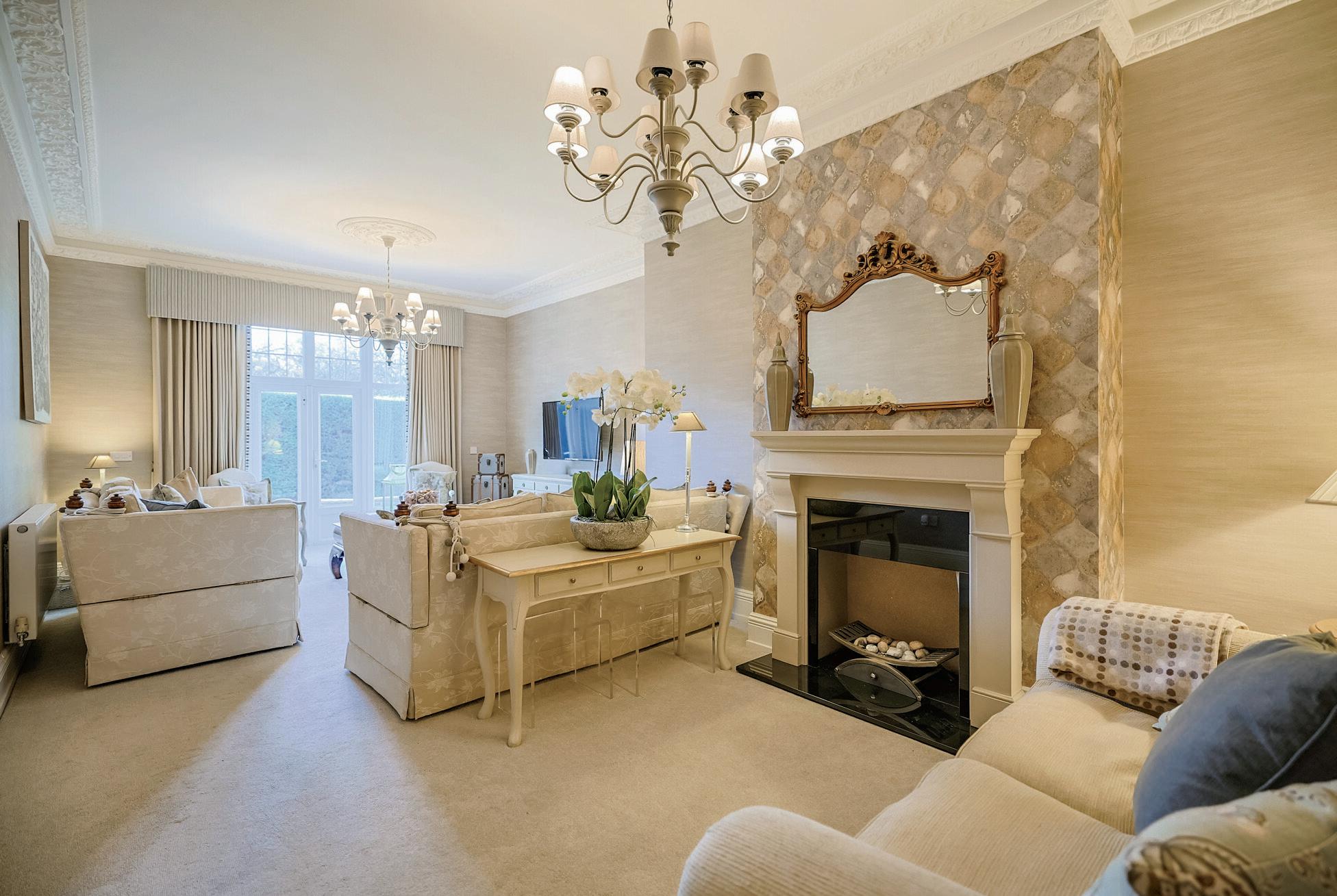 Another wow room follows! The substantial lounge, laid with soft carpet and again featuring high ceilings with detailed coving and two elegant ceiling roses. To the rear, a large bay window with double patio doors leads directly onto the rear patio area. A feature fireplace completes this inviting space, offering a cosy environment for unwinding after long days.