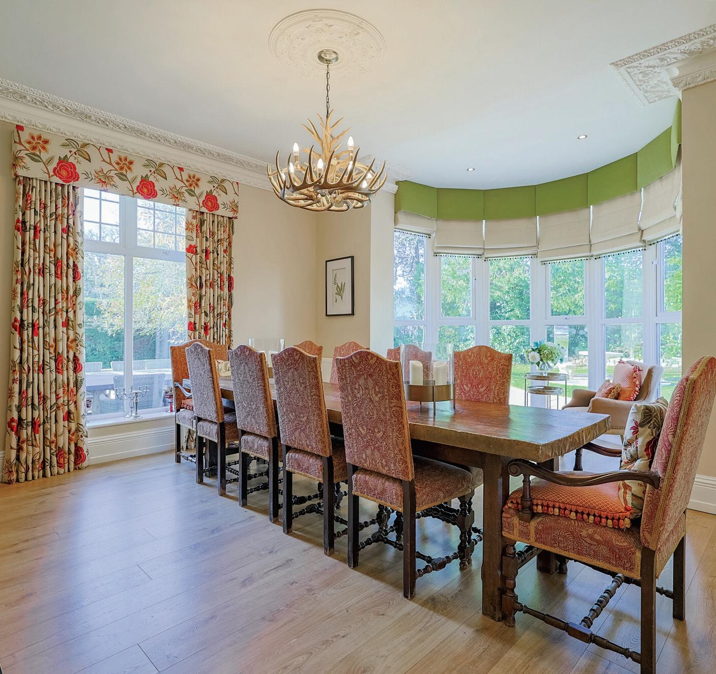 First on your right is the impressive dining room, where a floor-to-ceiling bay window overlooking the beautiful grounds draws your eyes instantly, flooding the room with natural light. An additional large rear window enhances the airy feel, while oak flooring, high ceilings with detailed coving and a ceiling rose, spotlights and central lighting create a refined atmosphere. A gorgeous oak feature fireplace provides a stunning focal point, and the generous proportions allow space for a large dining set, perfect for entertaining loved ones.