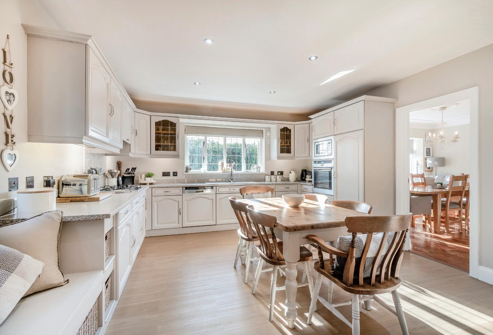 On entering you are greeted by a large central reception hallway with a contemporary oak and glass staircase, fitted coats cupboards and a guest cloakroom. On the right is the main reception room which is an exceptional size and really bright with French doors opening to the rear sun terrace, windows on the side and to the front overlooking the garden, there is an impressive stone fireplace with wood burner and a parquet wood floor. The dining room is another bright, good size room and is at the rear with a parquet wood floor and a deep bay window overlooking the rear garden. On the left of the hall is the kitchen/breakfast room which is fitted with an extensive range of light grey units with contrasting work surfaces, gas hob and an integrated oven, microwave, dishwasher and fridge, there is plenty of space for a breakfast table. A separate utility room has plumbing for a washing machine, dryer and further cupboard space. There is a further study/snug which overlooks the front garden.