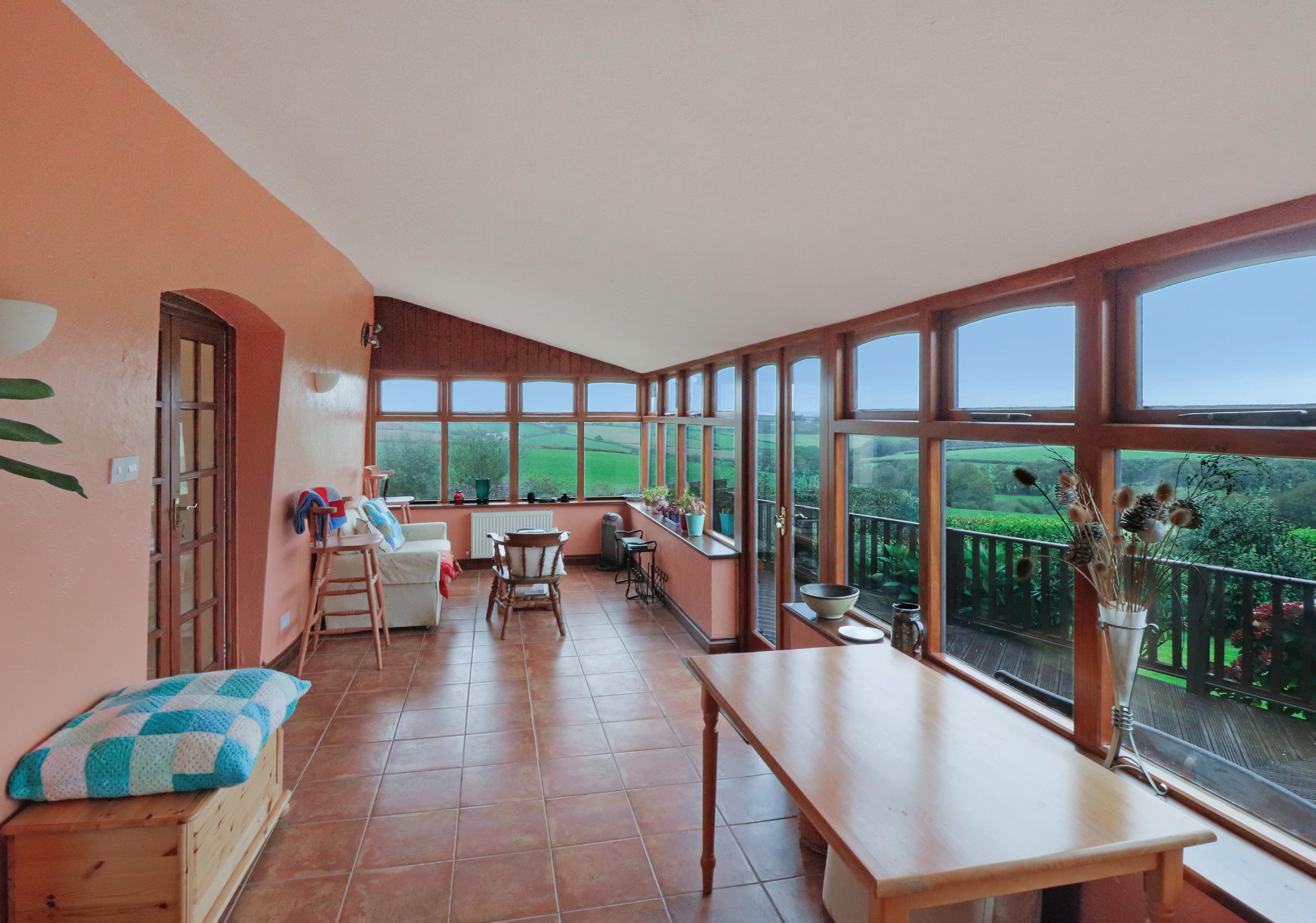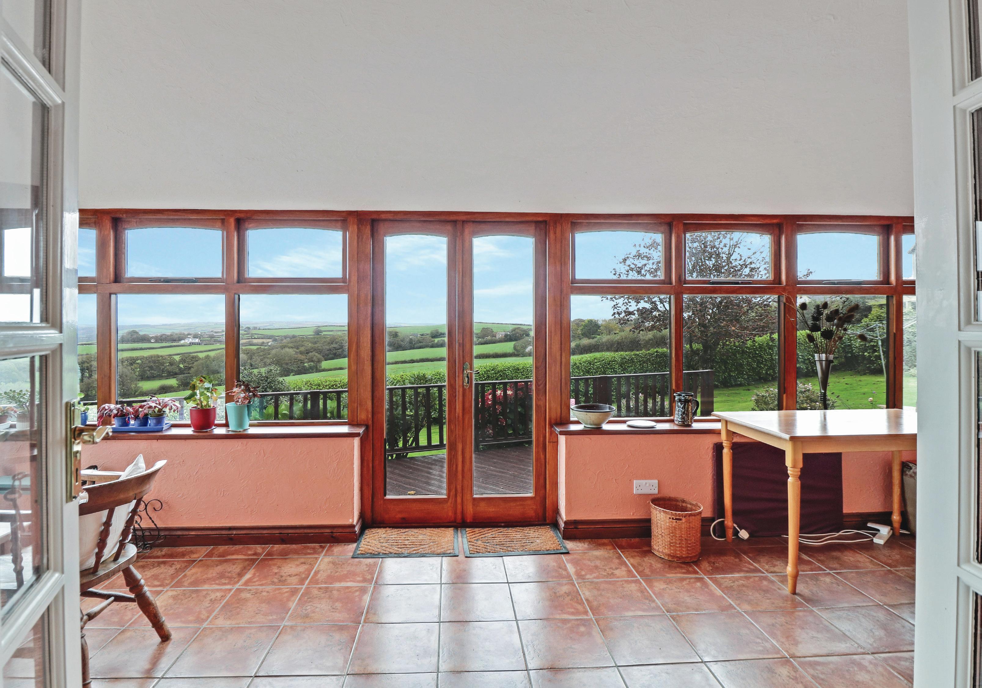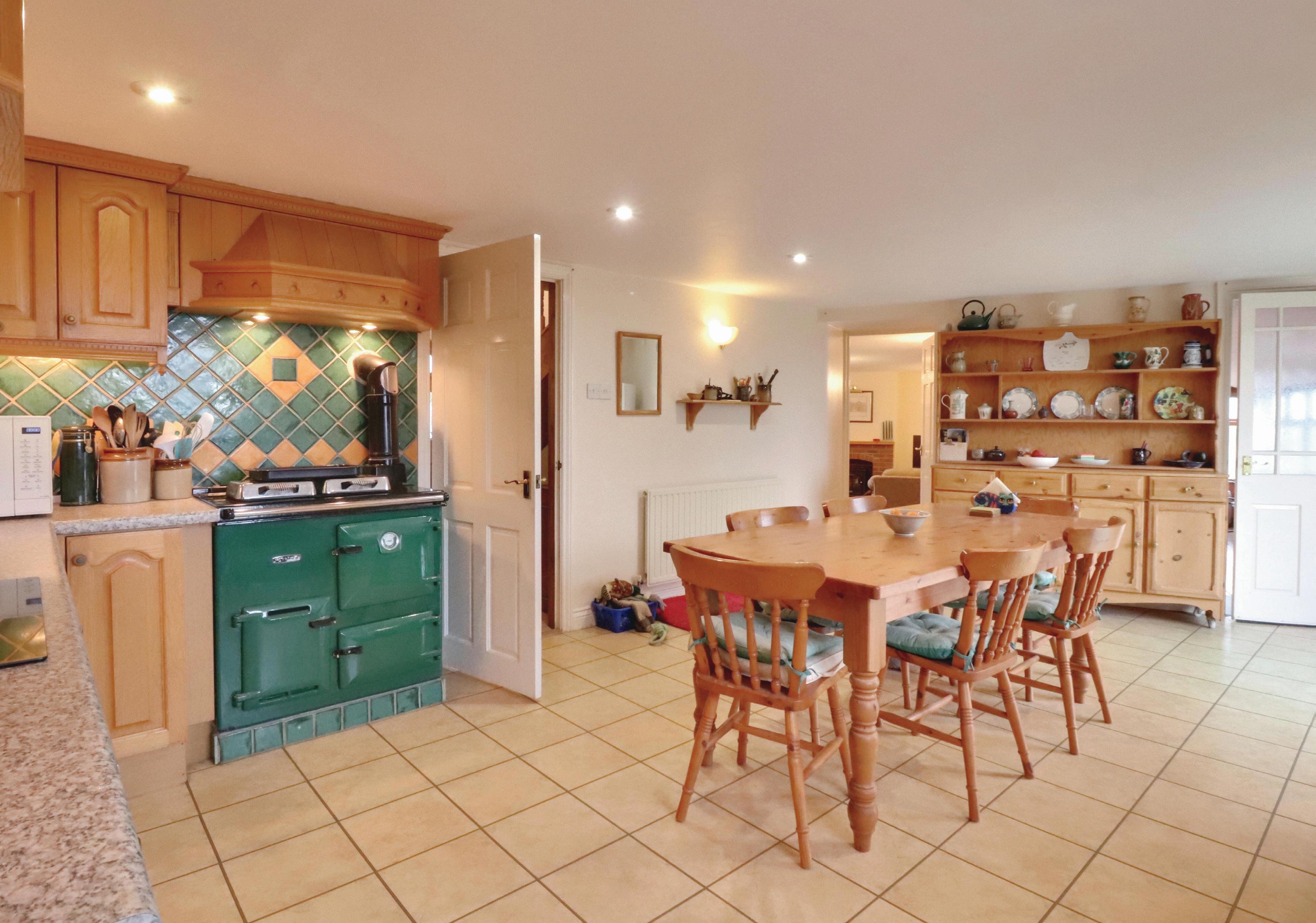 The westerly facing 23’ sitting room is a lovely room with a feature brick fireplace as its focal point, and having a long window seat from which you can enjoy the light from the setting of the sun or the views through the double doors that open up into the 22’ garden room on the eastern side. The garden room gives panoramic views over the rolling Devon countryside to Exmoor in the far distance and being on the eastern side is a great way to enjoy the rising of the sun of a morning. Both this room and the sitting room link with the kitchen/breakfast room thus creating a wonderful flow for entertaining friends and family. The kitchen/breakfast room has a floor to ceiling set of windows making the most of the distant view and has an extensive range of wall, floor and drawer units with associated work tops and there is ample space for a farmhouse style kitchen table and chairs. For someone who enjoys cooking and entertaining there is an electric hob with extractor above and oven below, and set off to one side is a traditional double oven electric Rayburn which gives a lovely warmth to the room and is great to snuggle up to having come in from the cold outside during the chillier months! Leading off is a utility room and cloakroom. Returning to the reception hall the 15’ dining room with ample seating for 8-10 people is on the left.