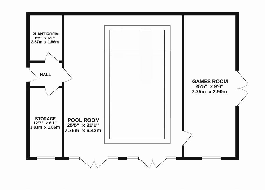 This is found just across from the main building. As well as having the main pool hall with doors that open onto a small full width terrace overlooking the fields, there is a 25’ games room with double doors to the outside, a storage room and plant room. Up on the roof on the southern side are both PV and refrigerant panels from the solar energy heat pump to keep the running costs of the building and pool to a minimum.
