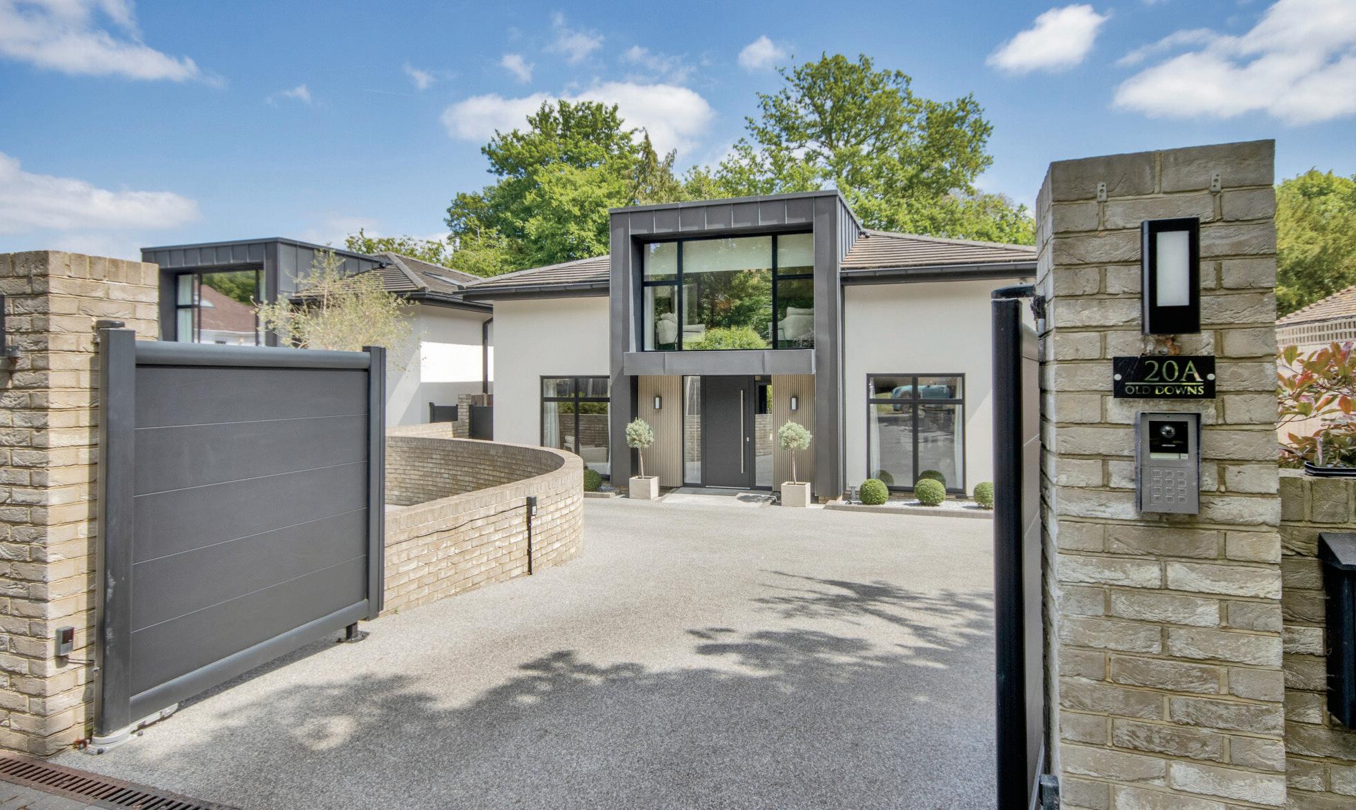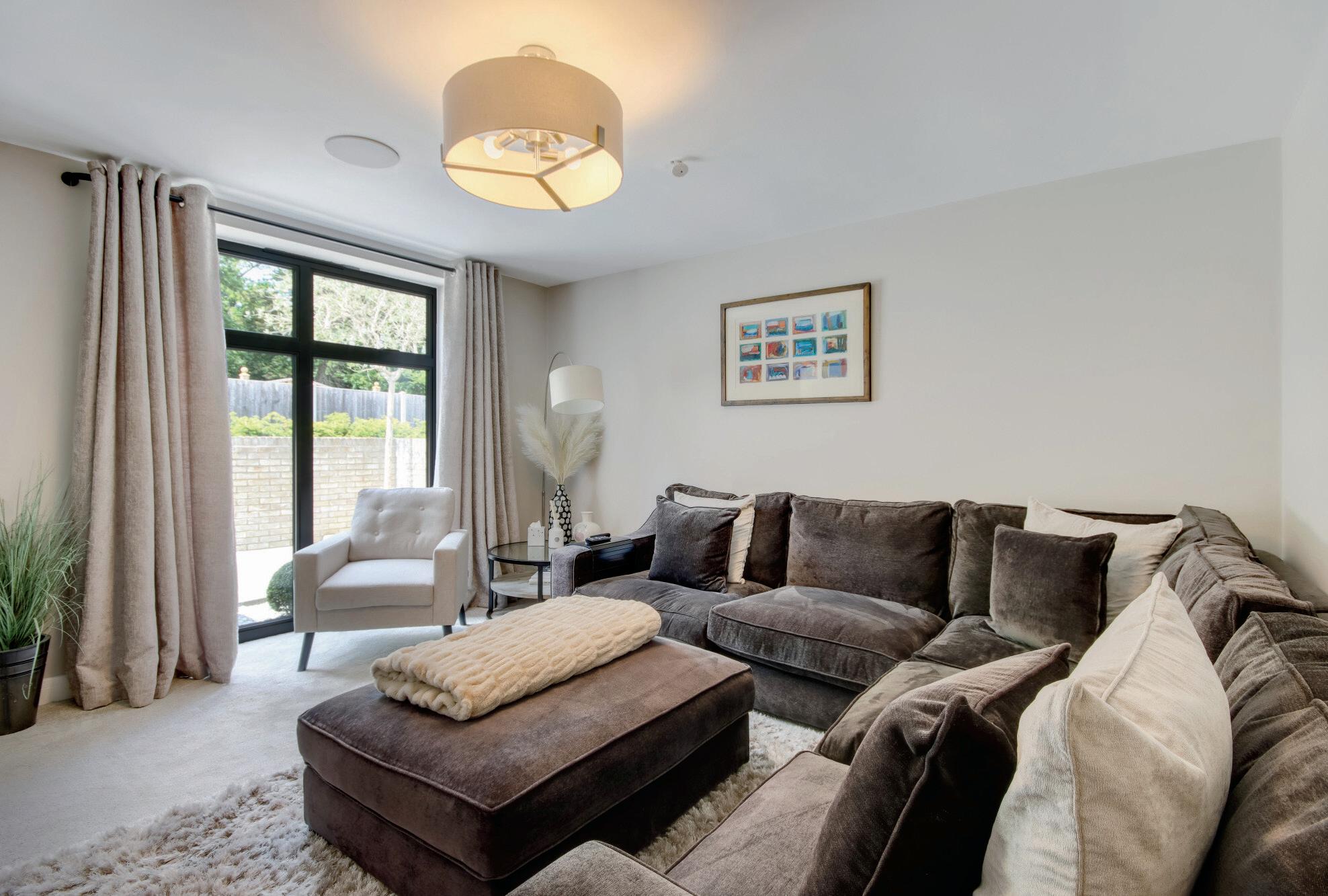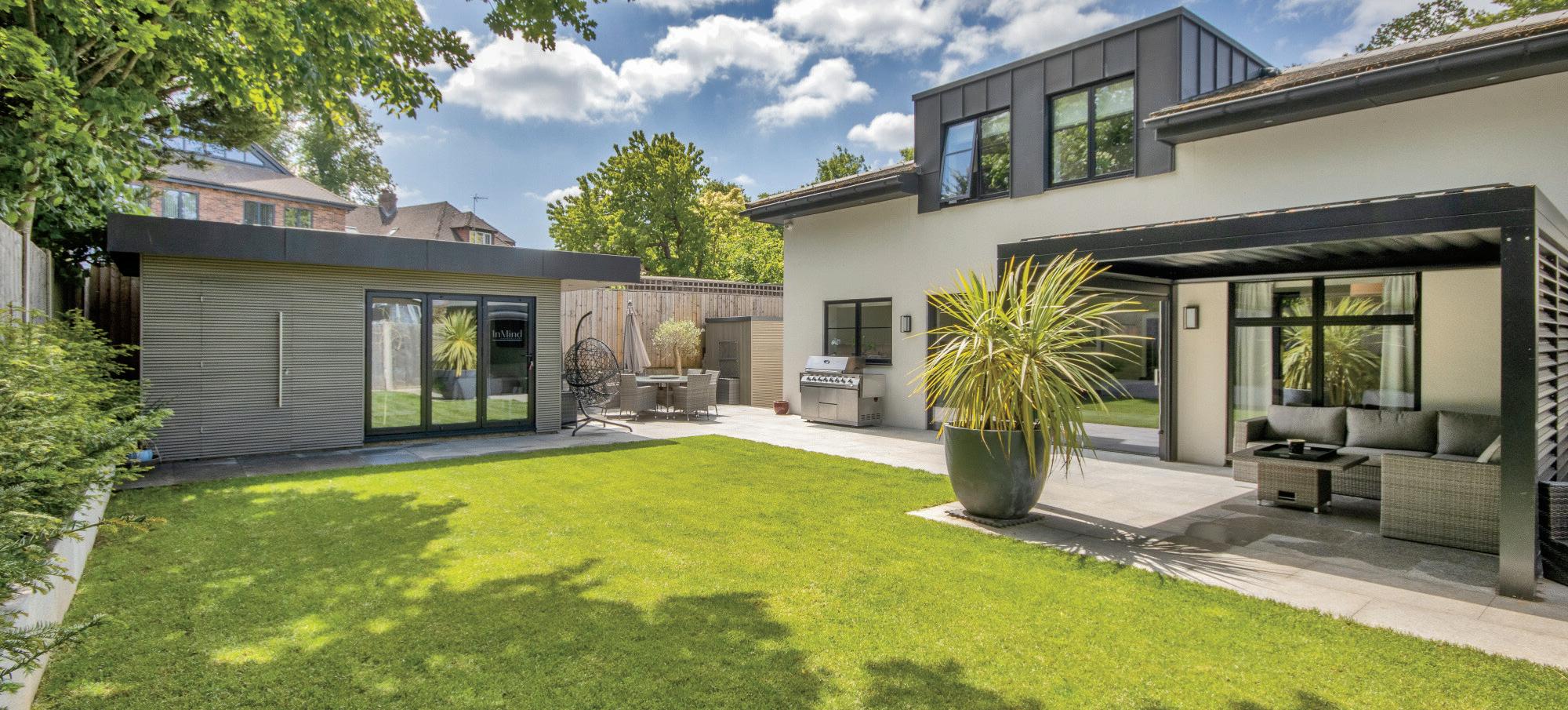 Floor-to-ceiling sliding glass doors, not only allow for an abundance of natural light to the living-dining space but also provide access to the beautifully landscaped, lowmaintenance rear garden. The space features a large patio area with a bespoke solid metal gazebo matching the window frames, offering a space to sit and enjoy the garden. The final addition to this build project is a garden room with bi-folding doors and storage cupboard, currently used for a therapy room. The space could easily be used as a home-gym or office as suitable alternatives.