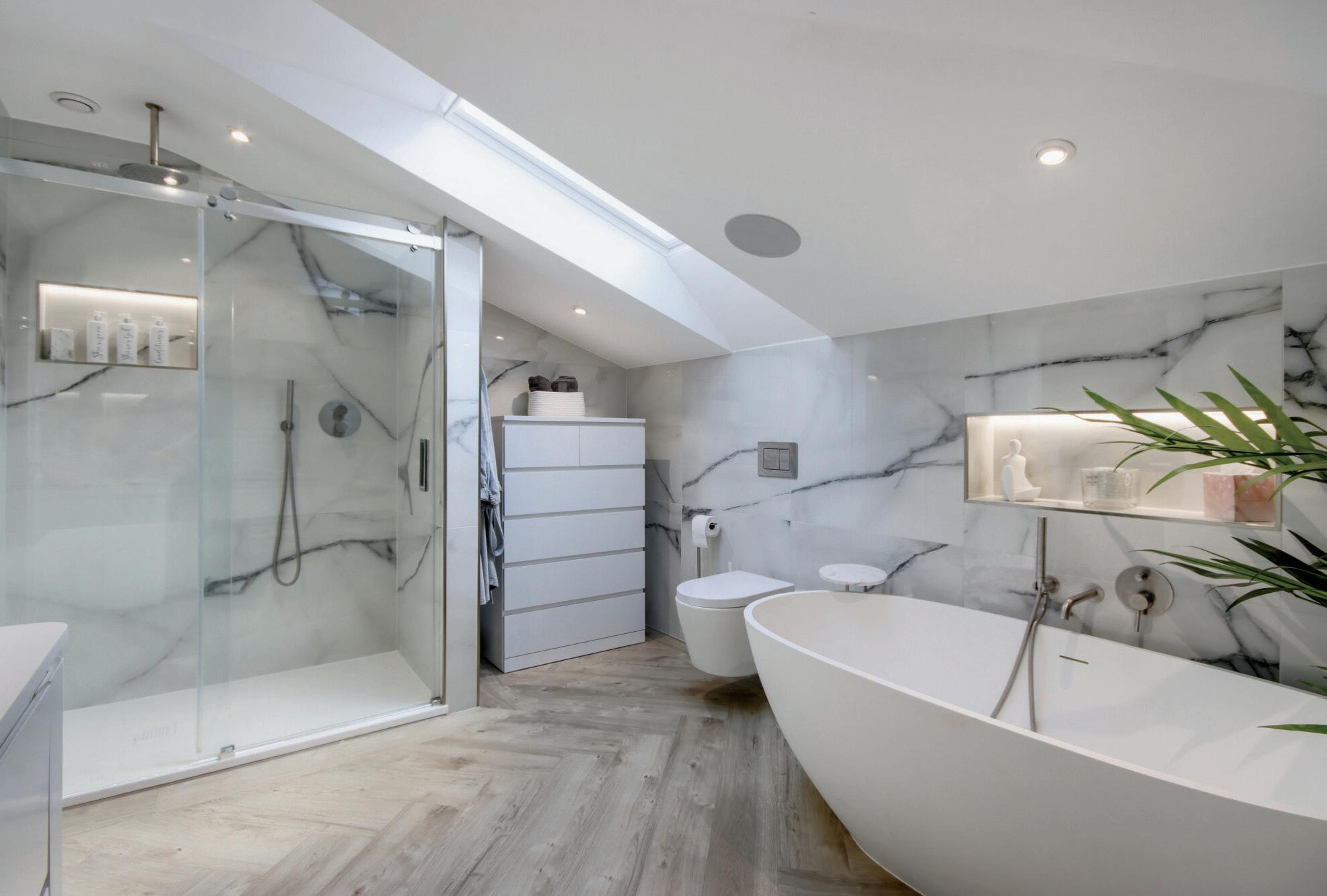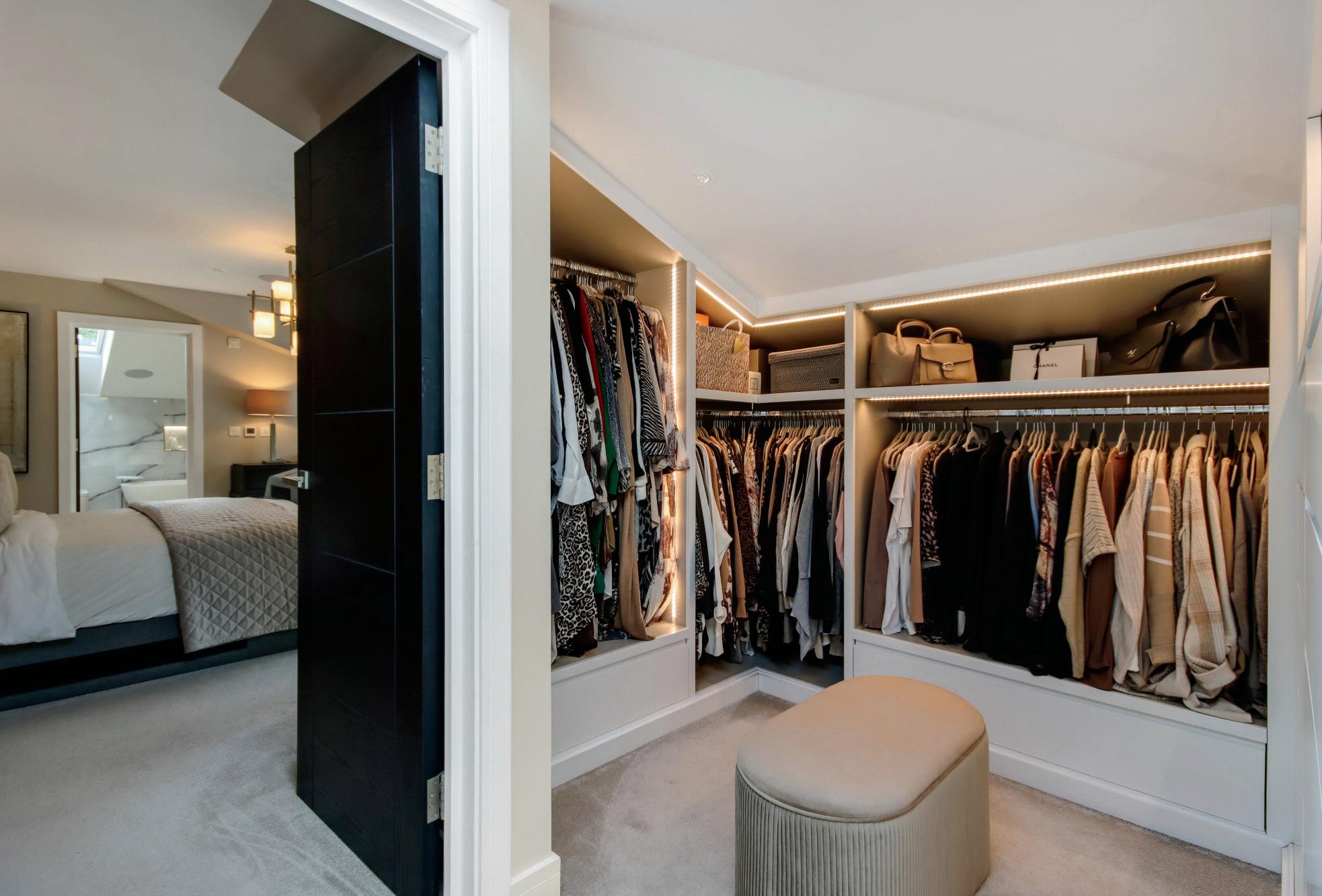 On approaching the first floor from the entrance hall, the property offers three double bedrooms and a large built in storage cupboard. The master suite spans the width of the property, complete with floor-to-ceiling glass windows, a reading or “chill” area which currently accommodates 2 armchairs, a huge dressing room with Velux window and a stylish en-suite bathroom. This features separate bath and shower, wall-hung toilet and wash-hand basin, again, with all sanitary ware via Lusso Stone. Further touches include a heated towel rail, a Velux window/skylight and a tiled wallrecess with lighting for storage.