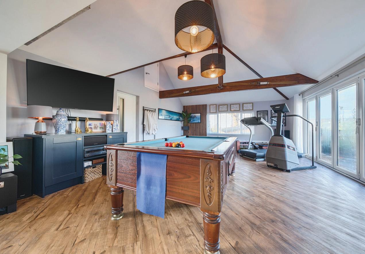 The sitting room enjoys views to both the front and rear, featuring an original open fireplace and currently arranged as a cinema room for the whole family to enjoy. From here, doors open into the extensive games/family room, a superb space designed for entertaining. It offers dedicated areas for playing pool, relaxing in the integrated indoor hot tub, or opening the bi-fold doors onto the rear entertaining terrace to take in the stunning views.