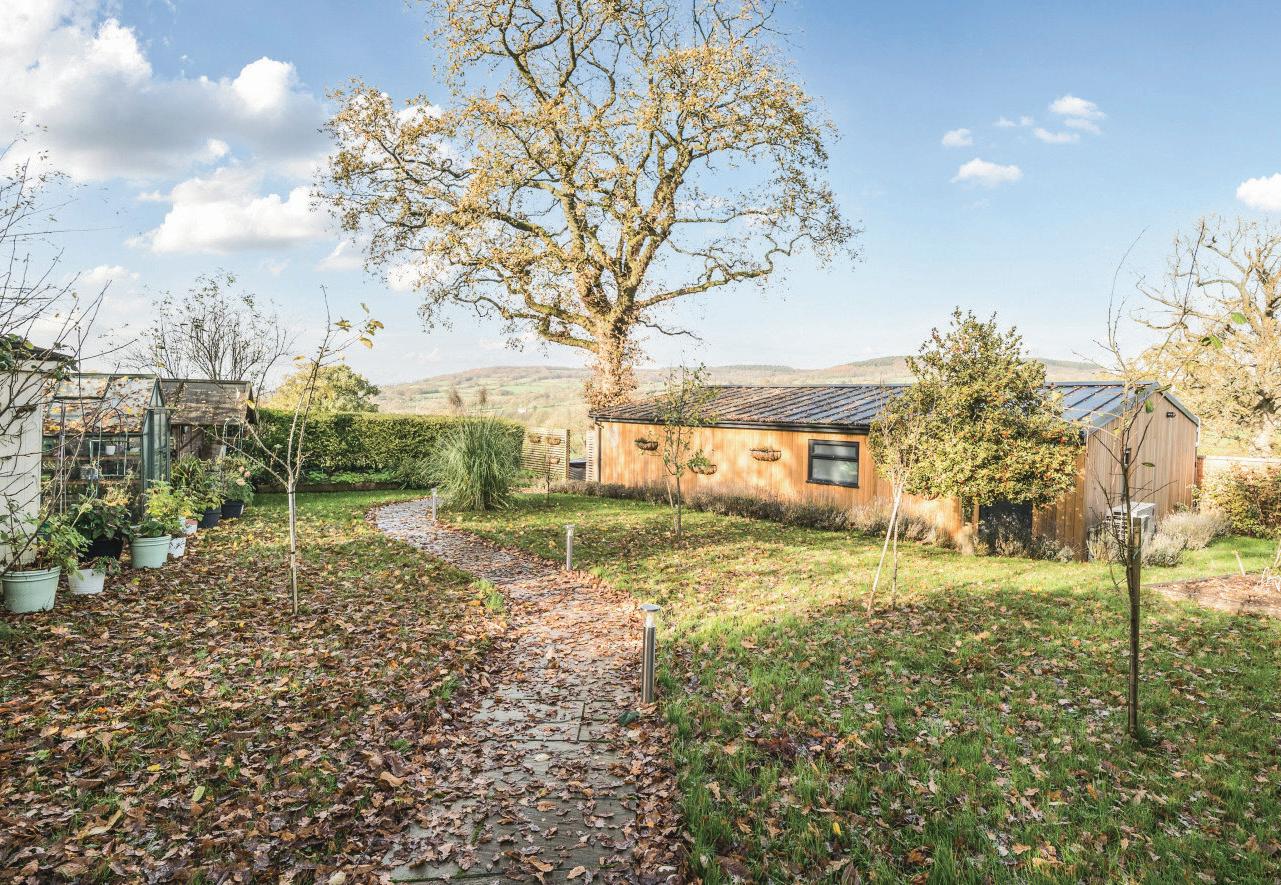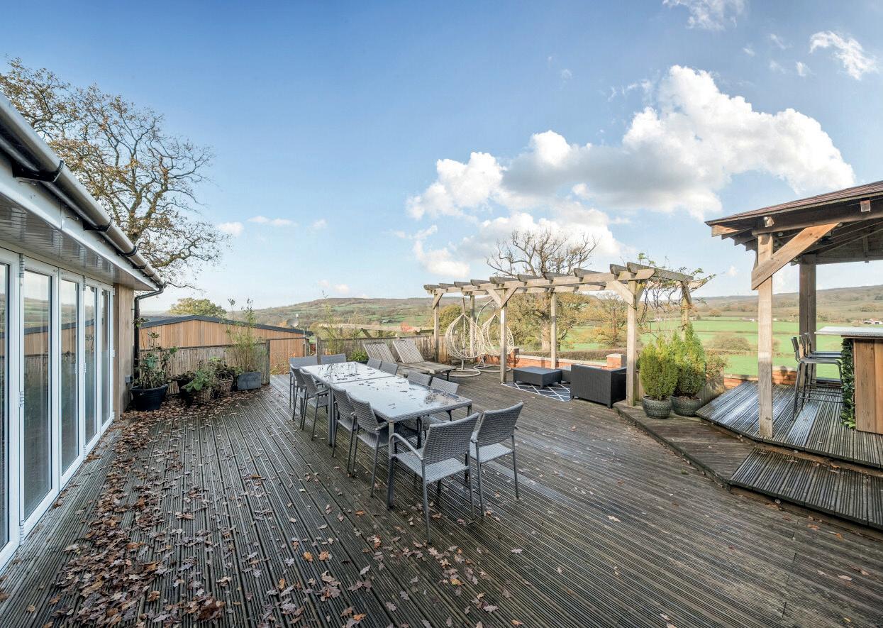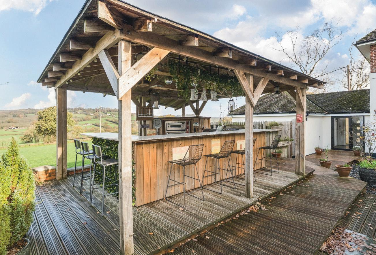 To the rear of the main house, where the views are at their best, a large decked terrace whilst an covered outdoor kitchen provides the perfect space for relaxing or entertaining, with doors opening directly from the house to create a seamless indoor–outdoor flow. Hidden discreetly beneath the decking lies a charming nod to the past — a World War II Anderson air raid shelter, now offering useful additional storage. Additional guest parking for The Studio can be found at the top of the garden.