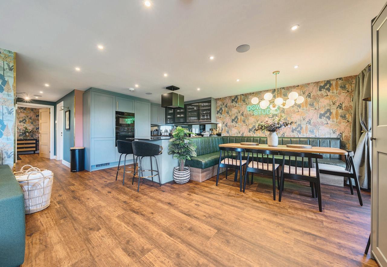 Nestled in a peaceful, private corner of the grounds with far-reaching views over the adjoining countryside, The Studio at Downmead is more than just a boutique-style Airbnb — it’s a beautifully crafted home in its own right. From the moment you arrive, the sense of space and style is clear. A generously proportioned open-plan kitchen, living, and dining room forms the heart of the home, offering a warm and welcoming atmosphere, enhanced by an air source heat pump and underfloor heating for year-round comfort.