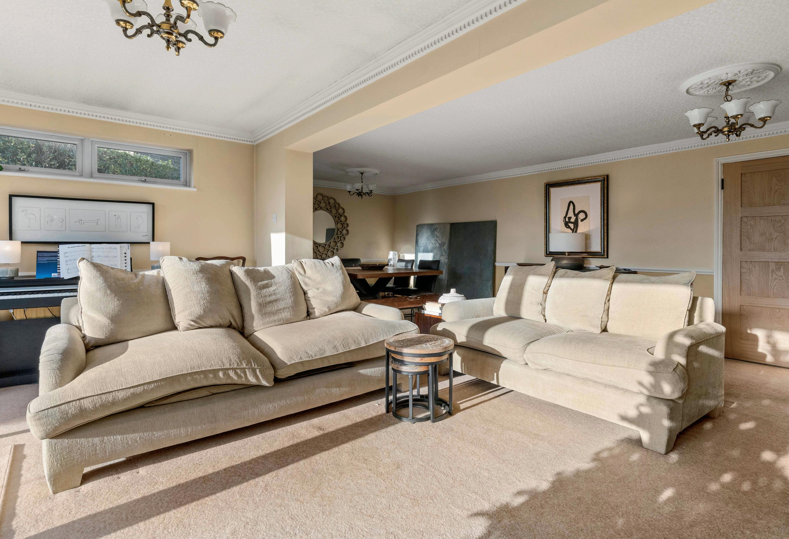 Coming back through the kitchen you enter the stunning lounge diner. This room has been decorated with warm, calming colours and with the substantial light coming in through the 5 metre wide patio doors, it feels like a big space which remains cosy and welcoming. Being a large L shaped room, it offers a place for a large dining room table and more than enough comfortable seating around the recently fitted wood burner. This room is flooded with light as it looks out onto the south facing garden.