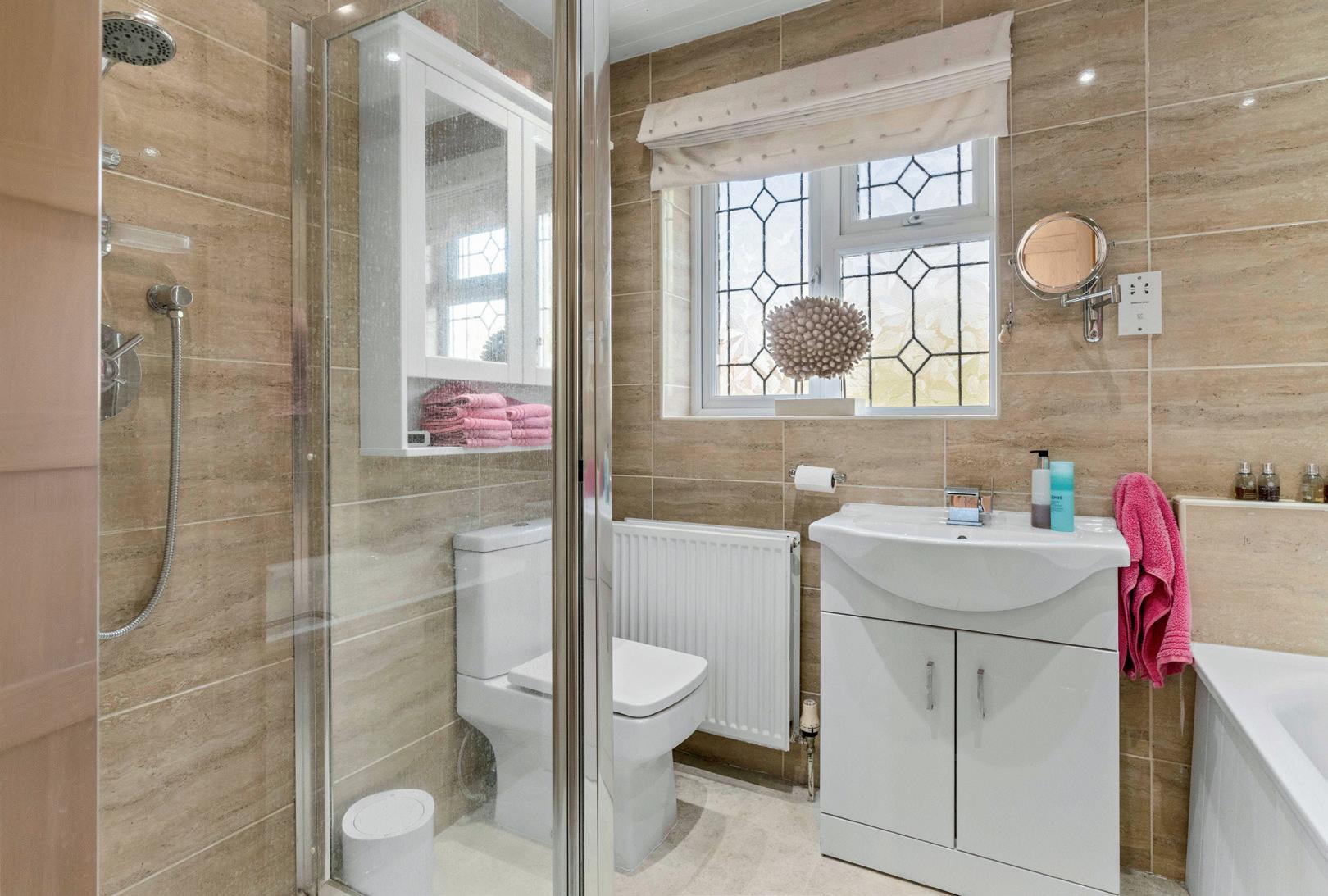 via a traditional hatch and loft ladder. This room has been boarded, carpeted, has electricity, lighting and heating so could easily be used as a den, or additional workspace. With the addition of dormer windows to give head height, this space also has the potential to be a fourth bedroom (subject to planning consent). All of the bedrooms at the rear of the property share views of distant London and, at night, the landscape is lit with the city lights, most prominent being The Shard.