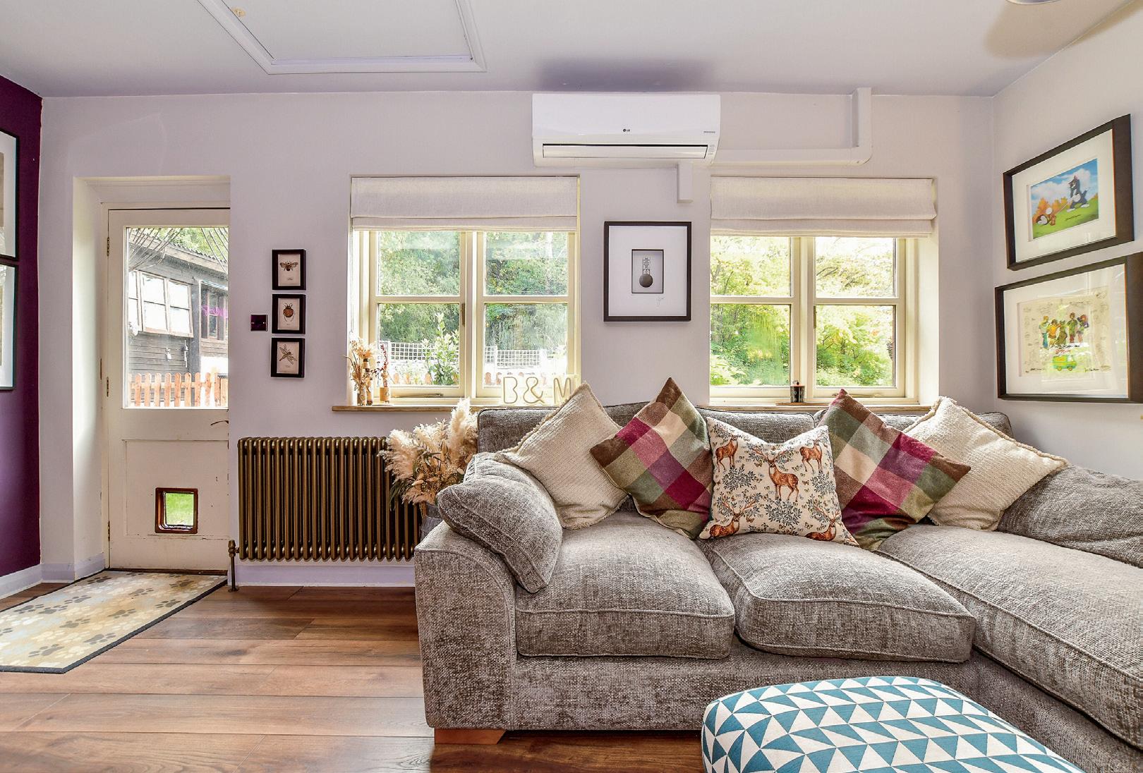 Inside, a welcoming hallway with built-in storage leads to a cloakroom area ideal for boots and coats, and a well-appointed kitchen fitted with stylish cabinetry, an induction hob with downdraft extractor, oven, and dishwasher. The bright dual-aspect living room offers generous space for both dining and relaxation, centred around a feature fireplace with a wood-burning stove — perfect for a roaring fire and a good book on a winter’s evening, or for lowering the cinema screen from the ceiling to transform the room into your own private movie theatre.
