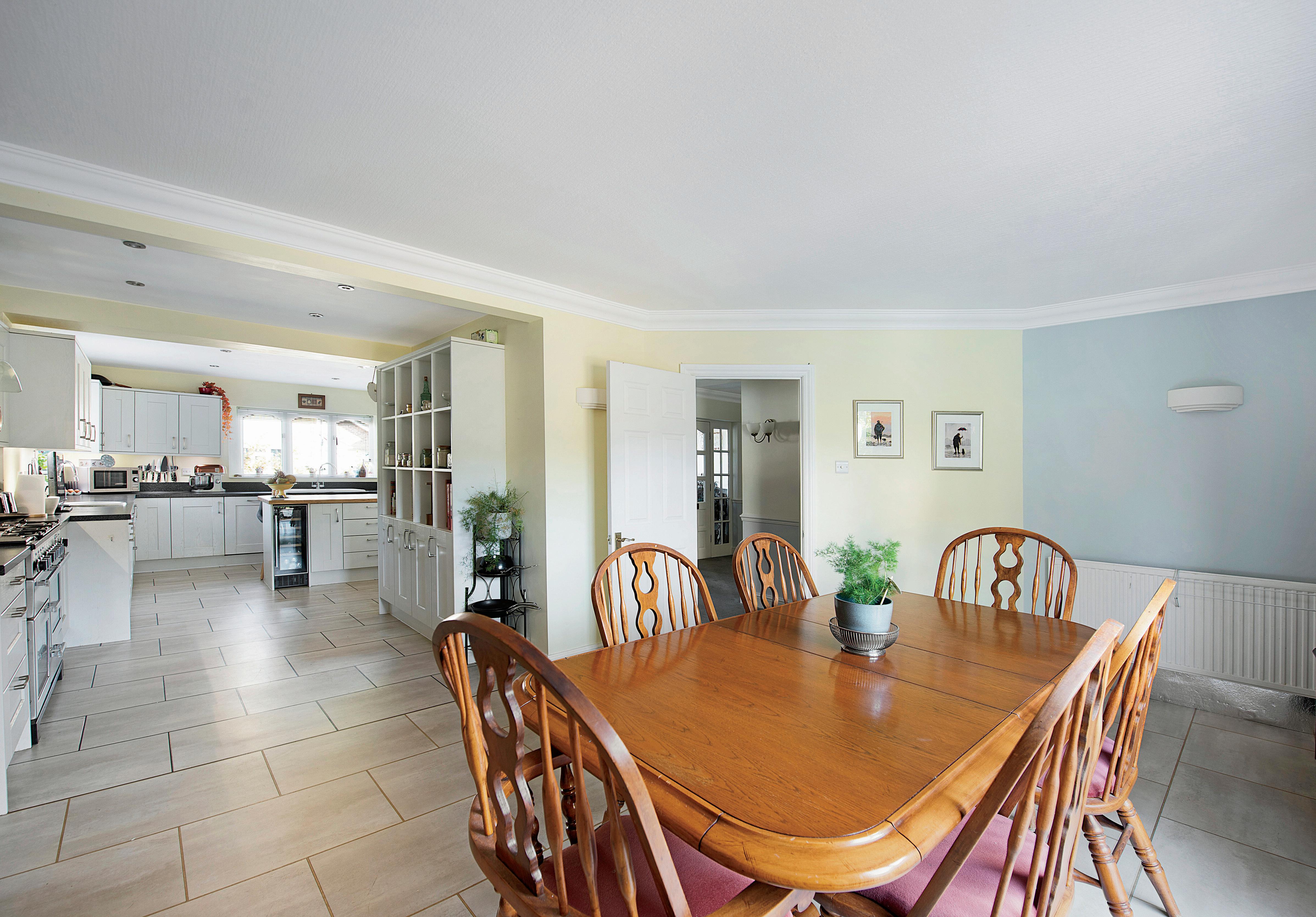 At the heart of the home is the open-plan kitchen and dining area, beautifully designed by the current owners. The kitchen features a central island with breakfast bar, built-in appliances, and generous workspace. The adjoining dining area is perfect for family gatherings but also offers scope to create a relaxed living space. Glazed doors open directly to the south-facing garden, seamlessly blending indoor and outdoor living.