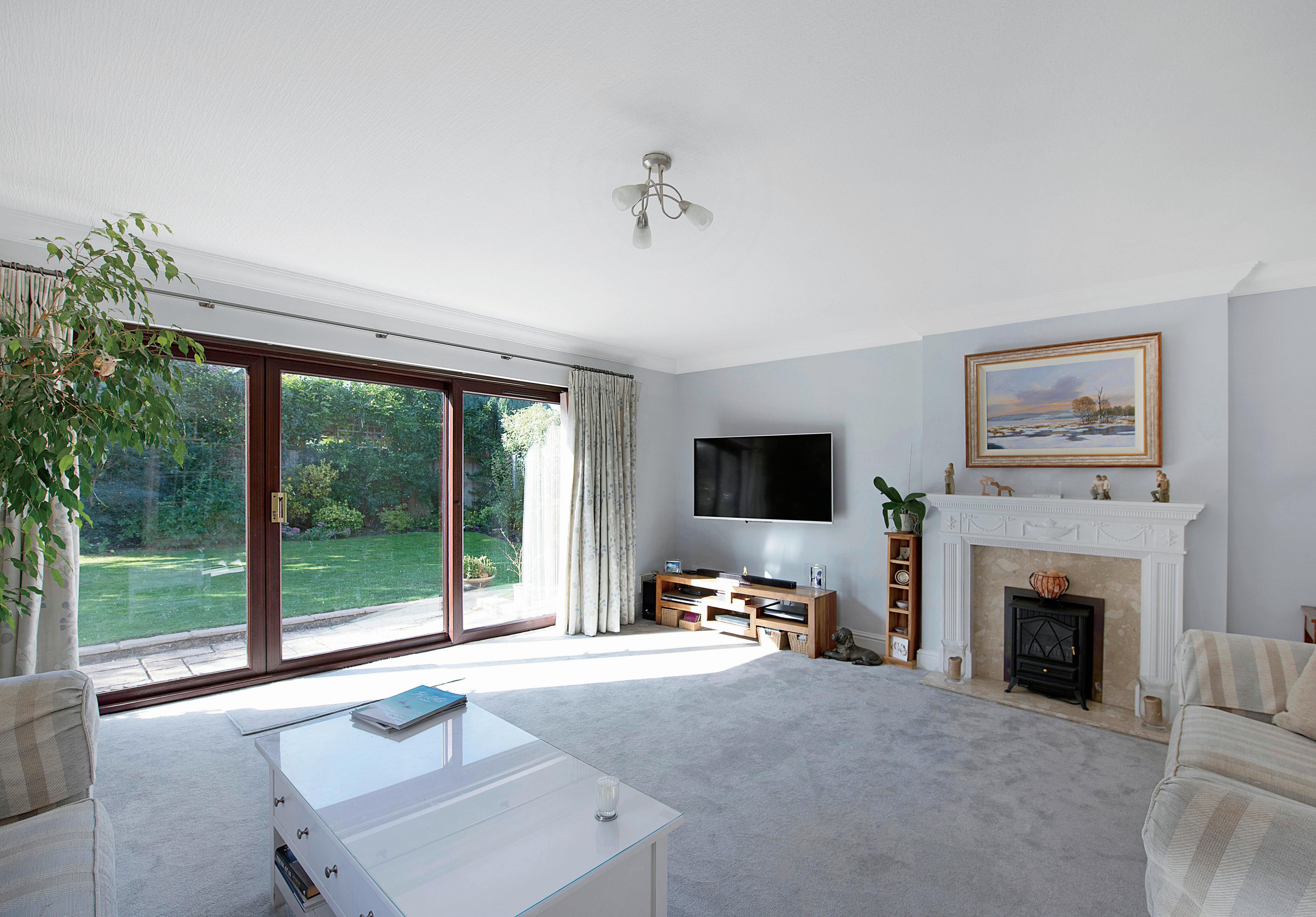 The dual-aspect sitting room, complete with feature fireplace, also connects to the garden, while a separate family room provides flexibility as a playroom, snug, or second lounge. A dedicated study offers a peaceful setting for homeworking.