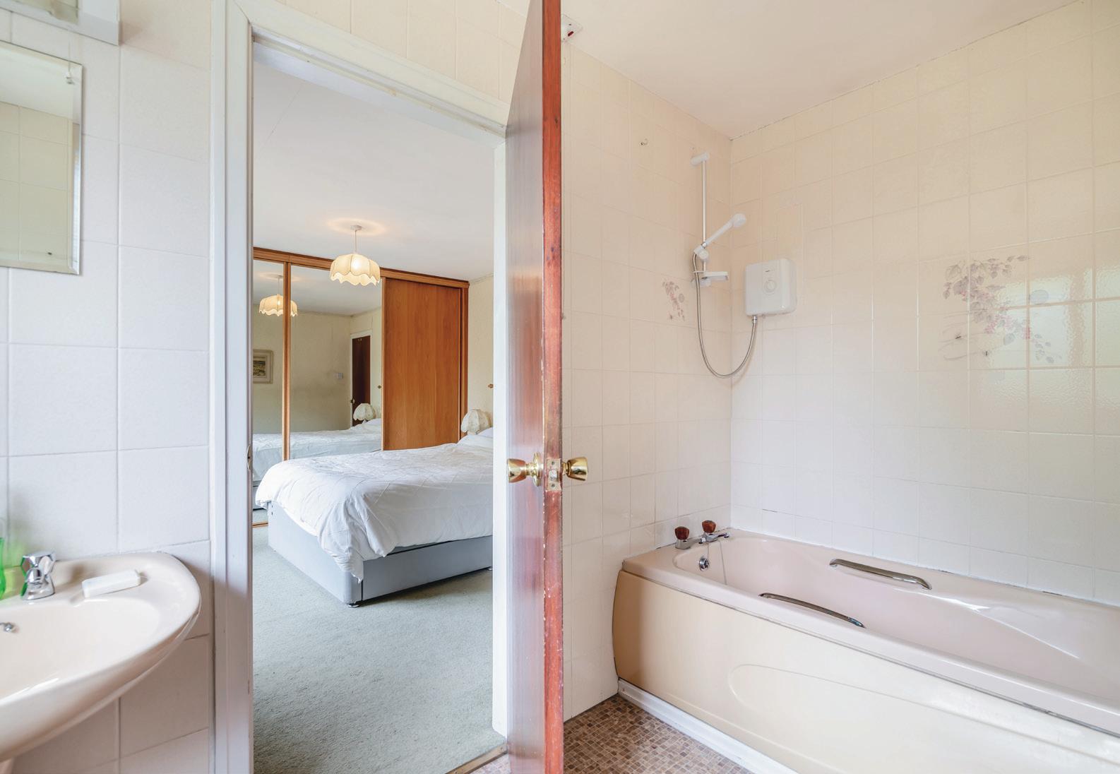 The family bathroom presents a four piece suite consisting of a low flush W.C, a pedestal wash hand basin, a panelled bath and a shower; the room having full tiling to the walls and a frosted window.