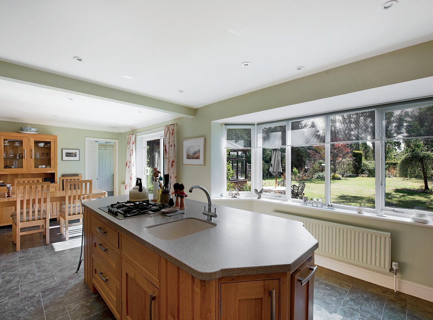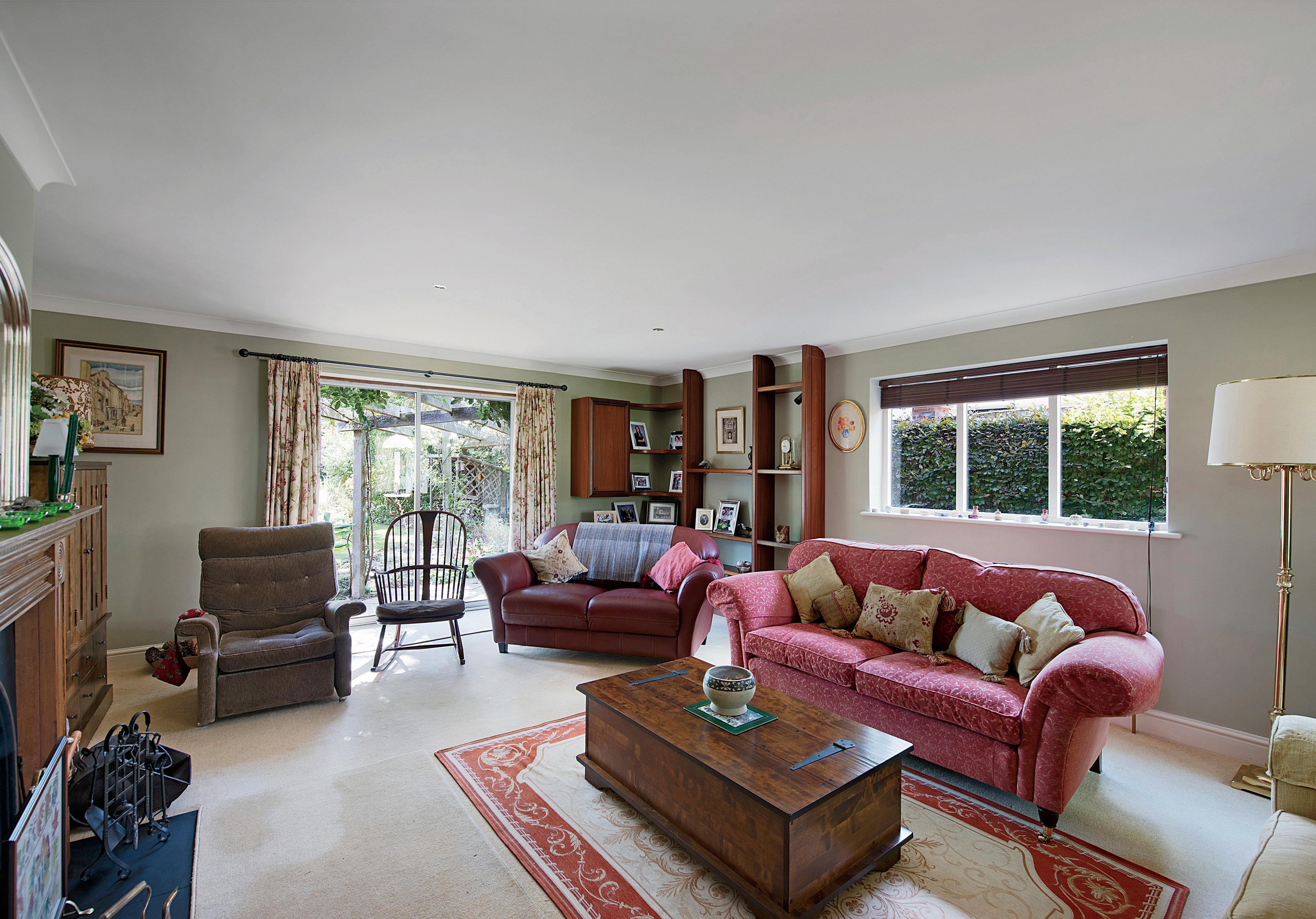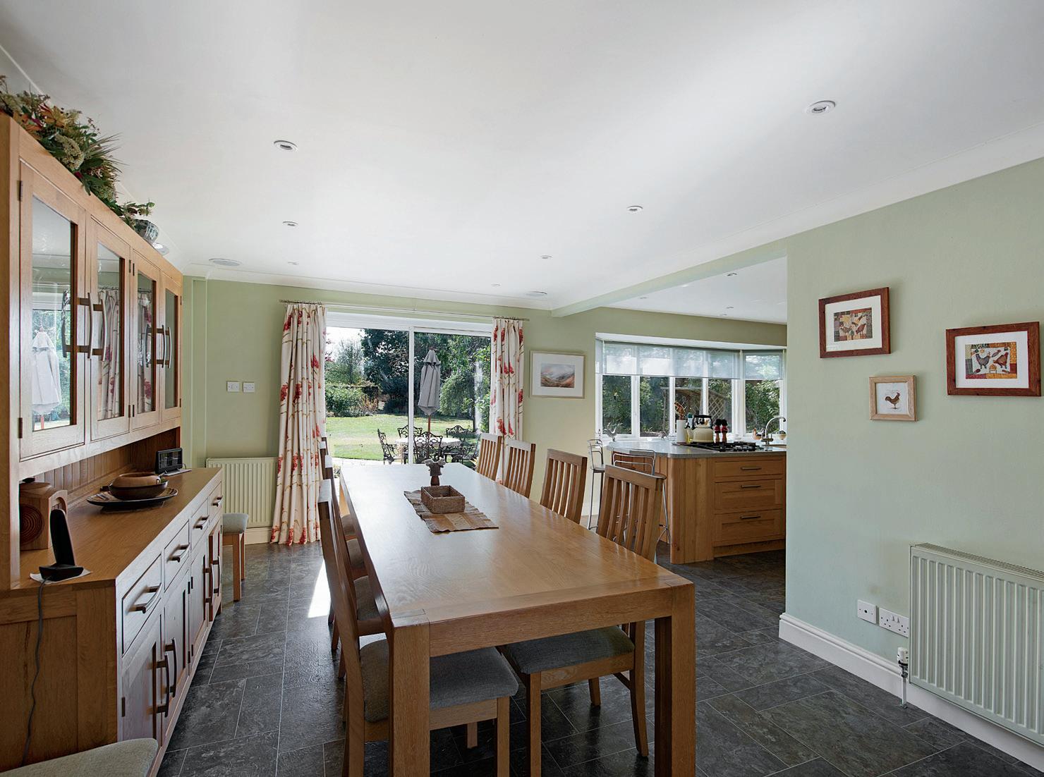 At the heart of the home lies the open-plan kitchen and dining room, a welcoming space for family living, entertaining, or cosy meals, with French doors opening directly to the garden. The generous triple-aspect sitting room, also with doors to the rear terrace, features an open fireplace, creating a wonderful room for gatherings all year round. A separate study provides a peaceful environment for homeworking but could equally serve as a snug or playroom. The large utility room ensures day-to-day practicality, while the conservatory offers a relaxing spot to enjoy views over the garden throughout the seasons.