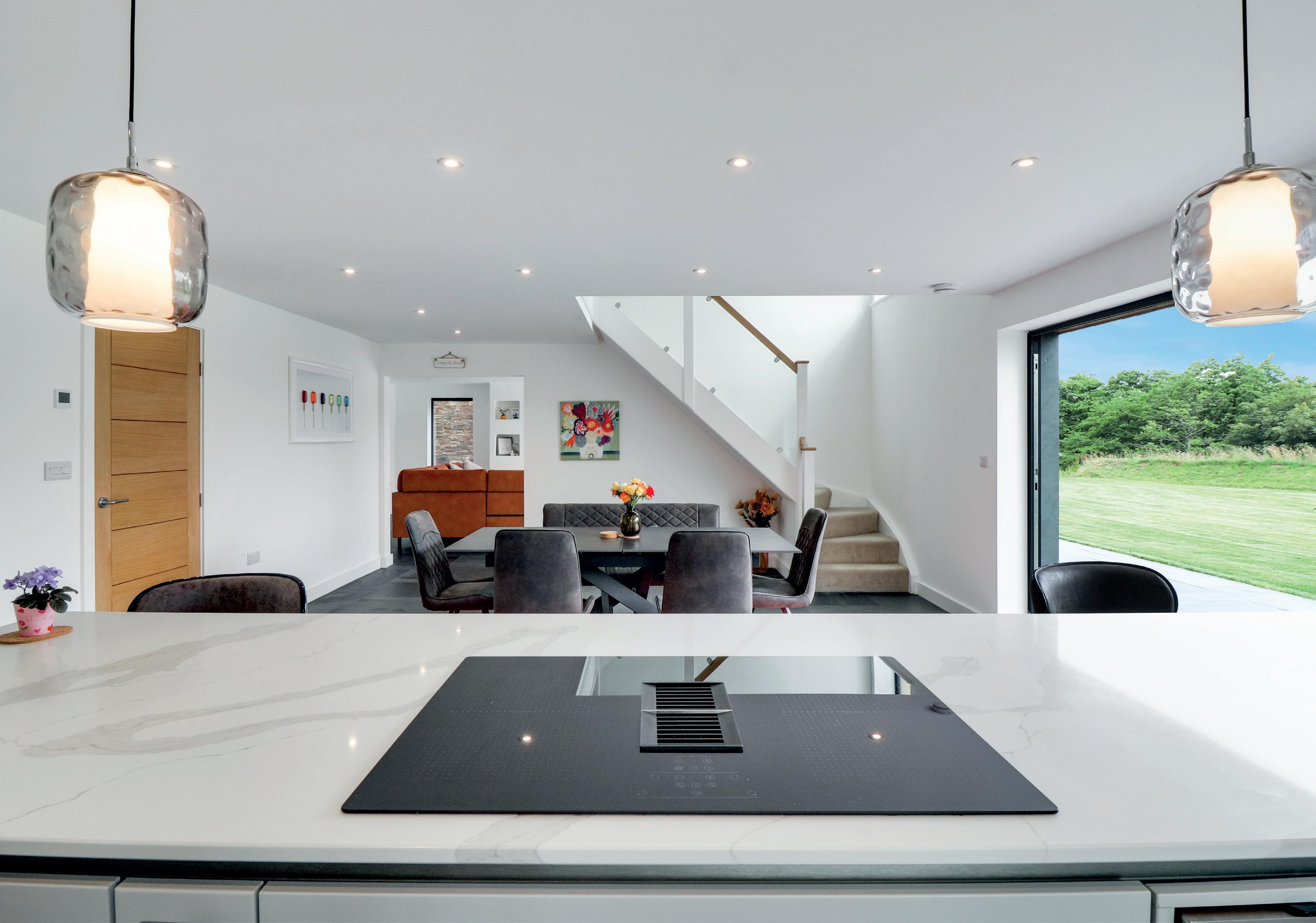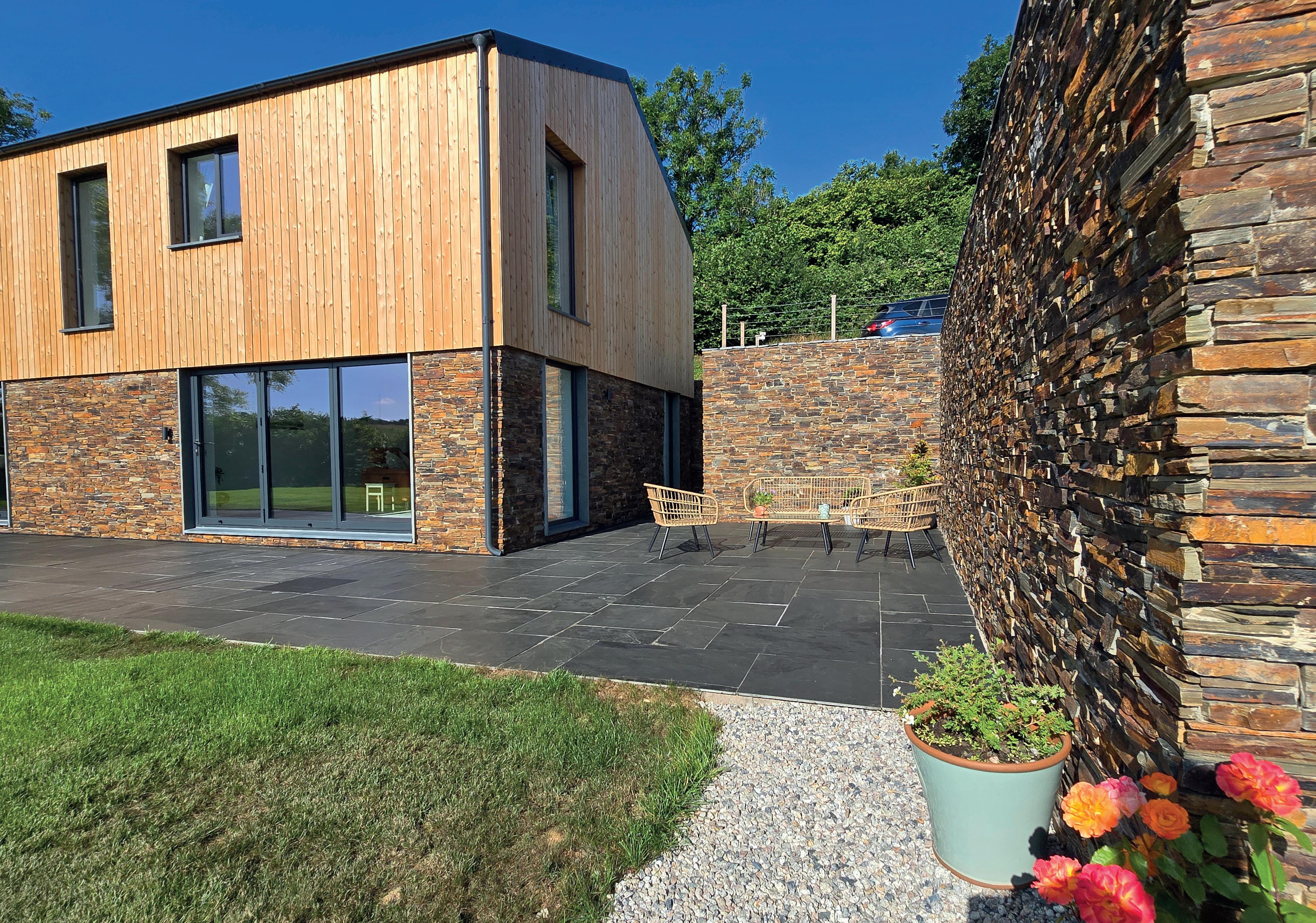 Inside, light floods in through large aluminium-framed windows and bi- and trifold doors. “Even on winter days, the sun pours in,” they say. “The open-plan living spaces flow seamlessly into the garden – creating a home that feels like a permanent holiday was always part of the plan!” Interiors are calm and paredback, with natural materials such as slate, cedar and stone, and thoughtful design touches including zoned underfloor heating and USB/USB-C sockets throughout. “We wanted something practical, low-maintenance and futureproof. It’s incredibly efficient to run, with PV panels and an air-source heat pump keeping energy costs low. We’ve loved living here as it is, but there’s huge scope to further develop the place – a keen gardener would have an amazing blank canvas to work with.” Ample parking space is another feature that enhances the appeal.
