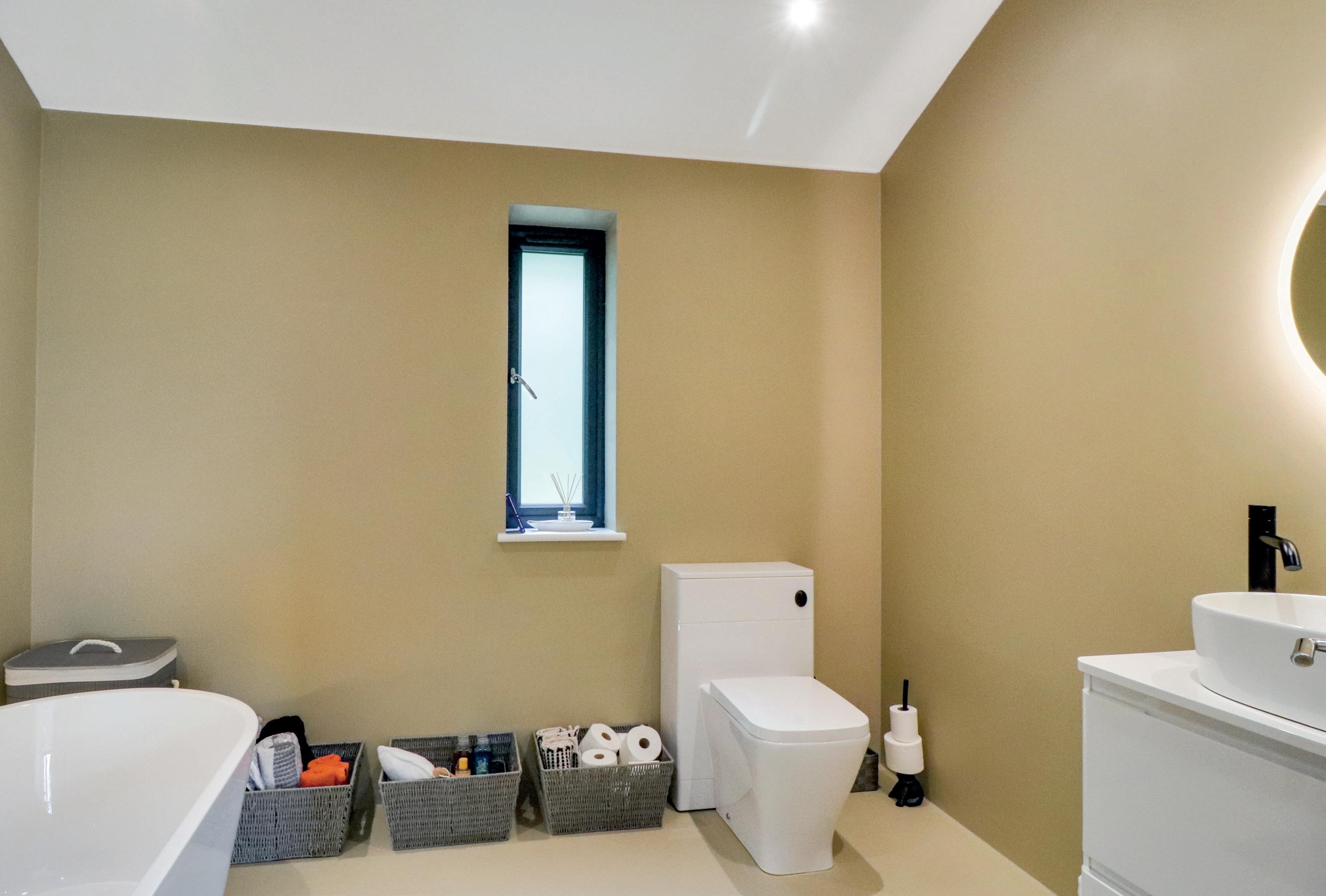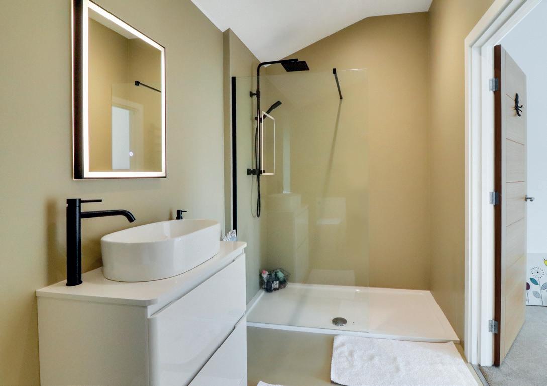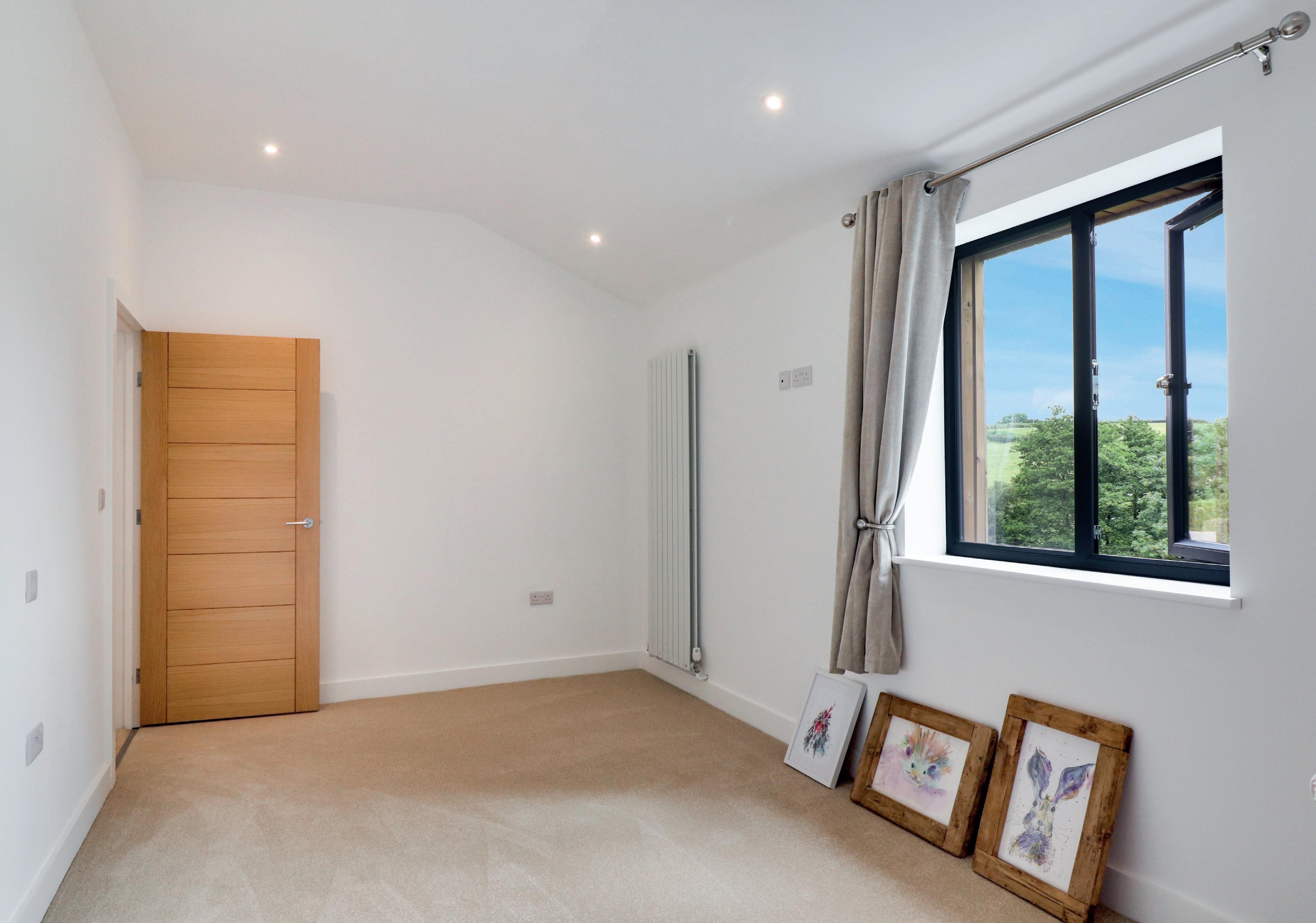 The size of the main bedroom would be a credit to many a sitting room and being double aspect enjoys a wonderful rural outlook especially on the eastern side through the large window. The positioning of the windows and doors within the room allow for an extensive range of wardrobes in two locations and above one there is a cabling point for internal lighting. The en suite has micro cement coloured walls as used heavily on the Continent and the result gives a very clean and modern twist as there are no tiles to be cleaned down. The contrast of the matt black taps, shower heads, heated towel rail, the gloss white back to wall cistern WC, freestanding counter top vanity with basin and illuminated LED mirror add to the luxury and calming feel. Across the landing are two further double bedrooms, again with cabling for wardrobe illumination, and one of these, being some 17’ in length, allows for it being a work from home room as well. These two bedrooms have use of the family bathroom the centre piece being a gloss white freestanding bath with floor mounted taps and display recess inset into the wall. The theme of coloured micro cement on the walls and floor along with black bathroom fittings is carried though from the en suite.