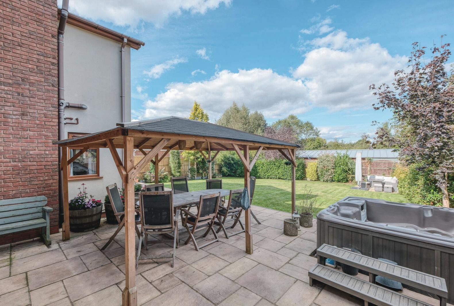 The rear garden extends the home’s appeal, offering a private and peaceful escape. A generous patio beneath a charming pergola is ideal for al fresco dining or relaxing in the shade, while the lawn provides ample space for children to play or family gatherings. Mature borders filled with vibrant shrubs and flowering plants enhance privacy and add a natural beauty to the space, making this garden as functional as it is picturesque.
