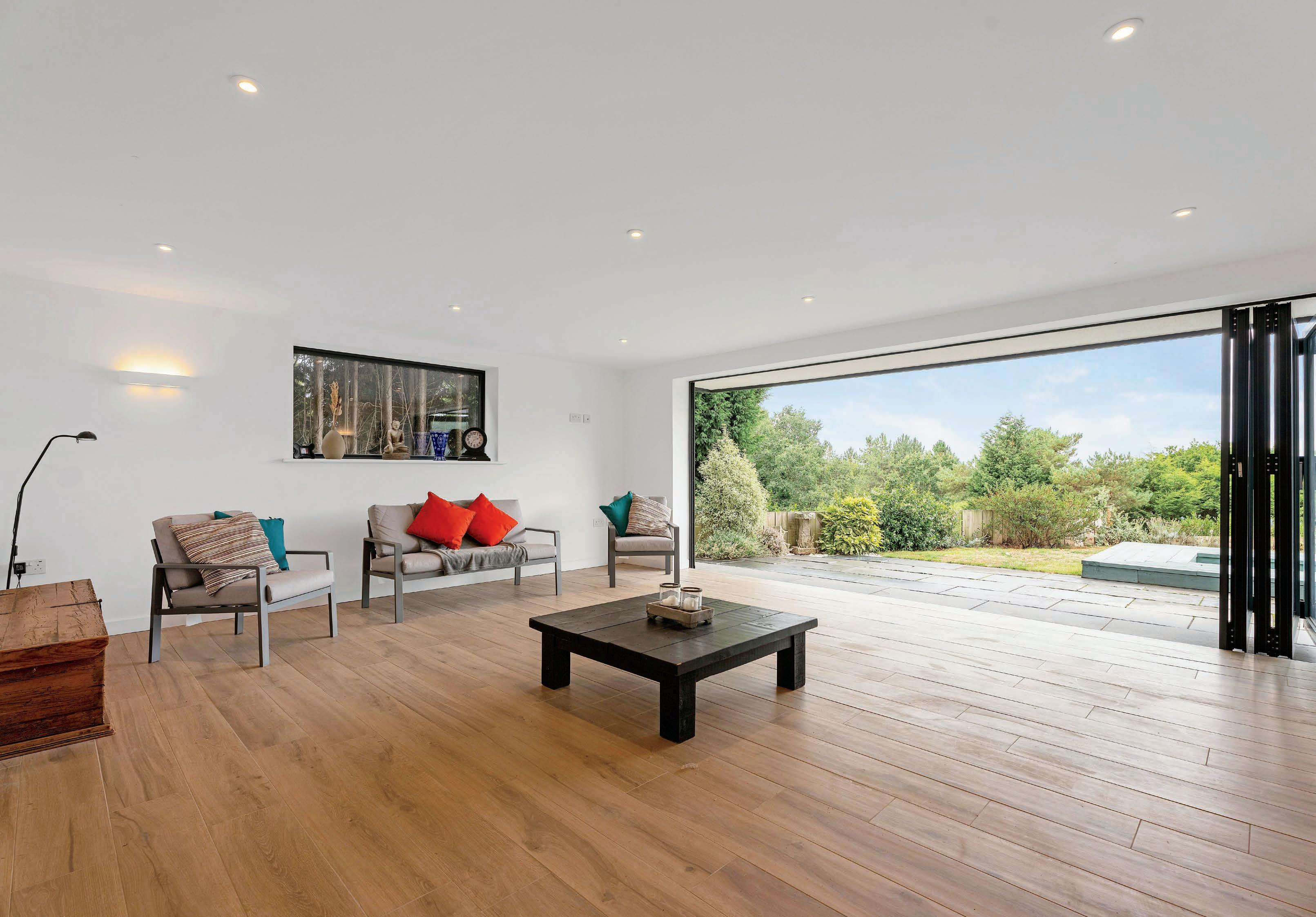 Further stairs lead down to another level, providing direct access to the garden. This level includes useful storage cupboards and a convenient door to a covered outdoor storage area. Bedroom three features bi-fold doors opening onto the patio and bedroom four is a generously sized room with fitted wardrobes and sliding glass doors leading out to the patio. A stylish shower room serves this floor. With its own access this floor could serve for multi-generational living.