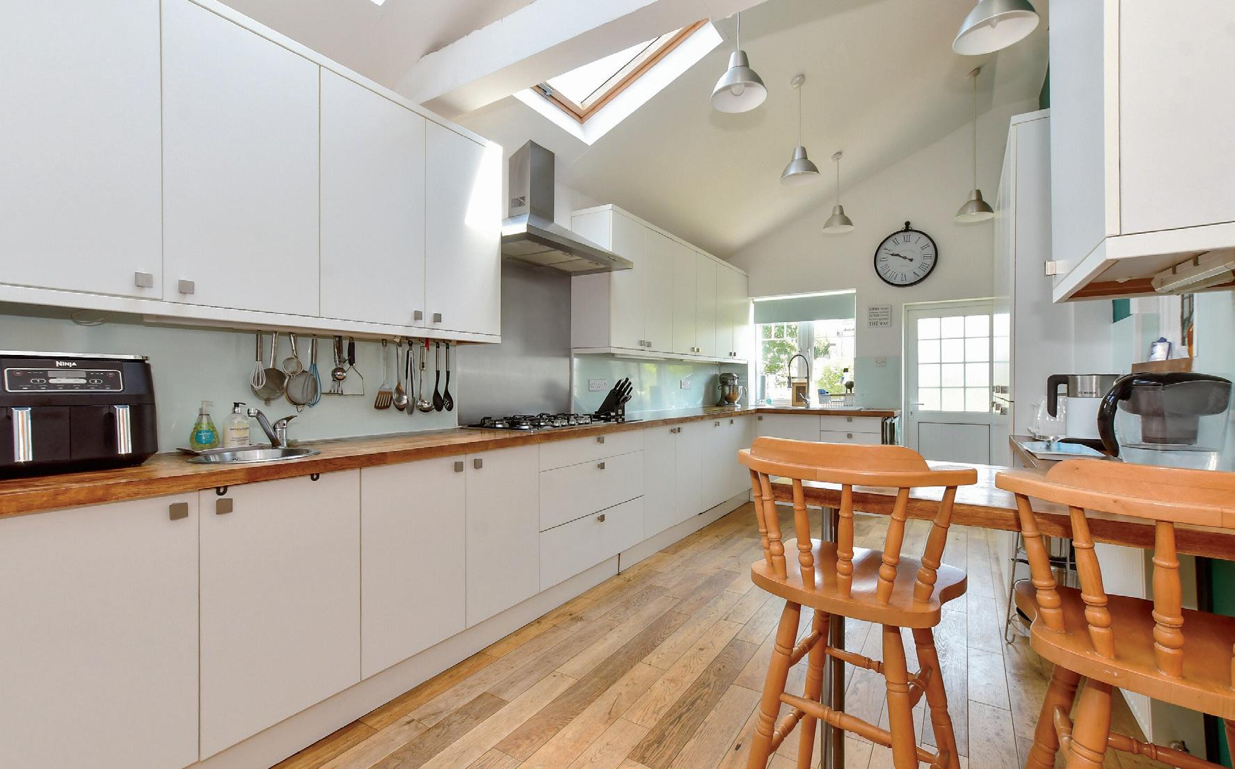 Double beech and glazed doors open into the delightful contemporary kitchen with engineered oak flooring, three Velux windows and access to the front garden. There is a corner larder, a breakfast bar and a raft of white flat fronted units housing an integrated hob, a steam oven and two fan ovens as well as a combi microwave, a full height fridge and a dishwasher.