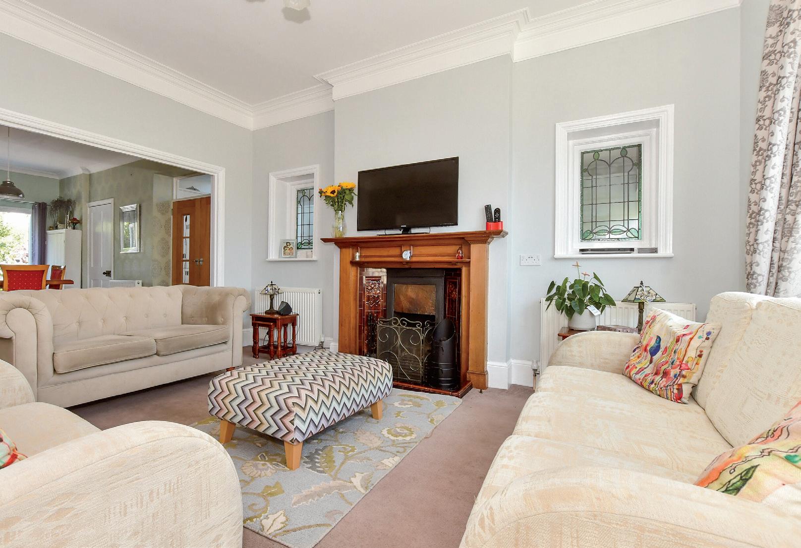 The large, dual aspect family and dining areas include an archway between the two, an original dresser/display cabinet and French doors to the upper decked patio in the dining area. While the family area features a wood surround fireplace with inset tiles and an open fire, a bay window and small stained glass windows to the adjacent kitchen. There is also a door to a cloakroom, storage facilities and the utility room with additional kitchen appliances and space for a washing machine and tumble dryer.