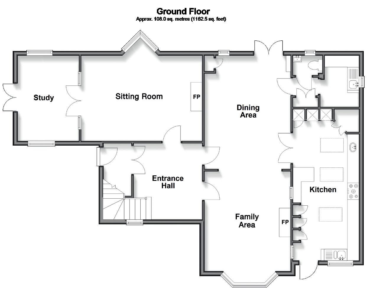 There is an elegant sitting room with a fascinating angled window, an impressive wood surround fireplace with an open fire and French doors to a beautifully fitted study. This has French doors to a side pathway and is ideal for anyone working from home as the French doors provide a direct entrance for business visitors.