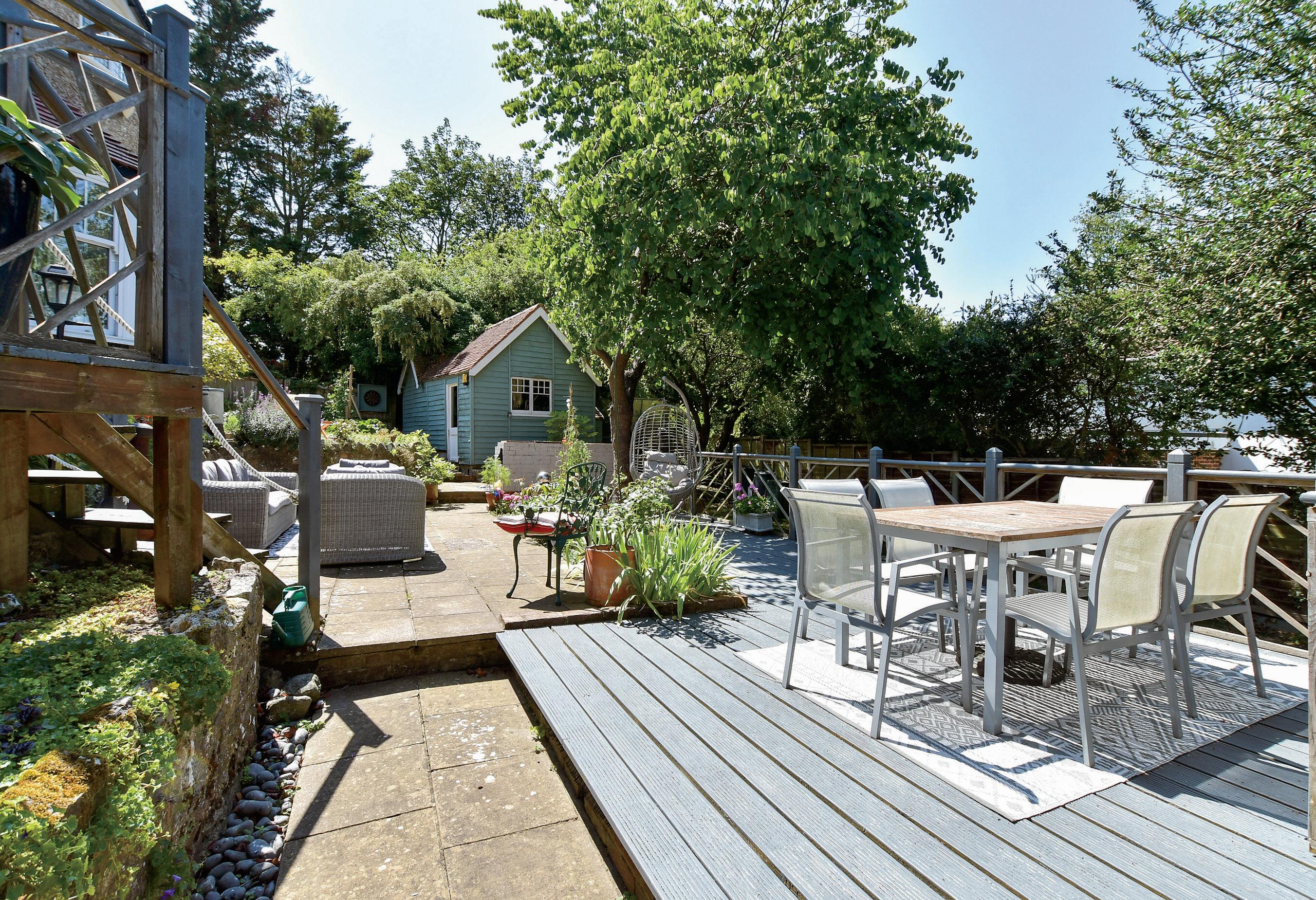 The outdoor space is another special feature of this property with lawns and various different seating areas so you can follow the sun as it moves through the day, including the upper patio with glimpses to the sea and steps down to a superb paved terrace. This is surrounded by flower and shrub borders as well as some delightful trees and where you can spend time with your friends and family or just sit and relax in the sunshine, There is also a decked patio for al fresco dining, a built in barbecue area and a useful vegetable patch. A separate pitched roof and wood clad outbuilding is currently used as a workshop and store but could always be converted into a detached annex, subject to the necessary planning permissions.