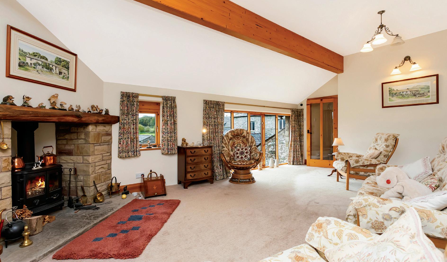 Upstairs, an impressive, light and airy first-floor sitting room takes full advantage of the panoramic views across the surrounding countryside. Set within a stone surround and under a wooden lintel, a Morso wood-burning stove adds rustic cosiness and charm, making this a perfect room for both quiet evenings in and entertaining.