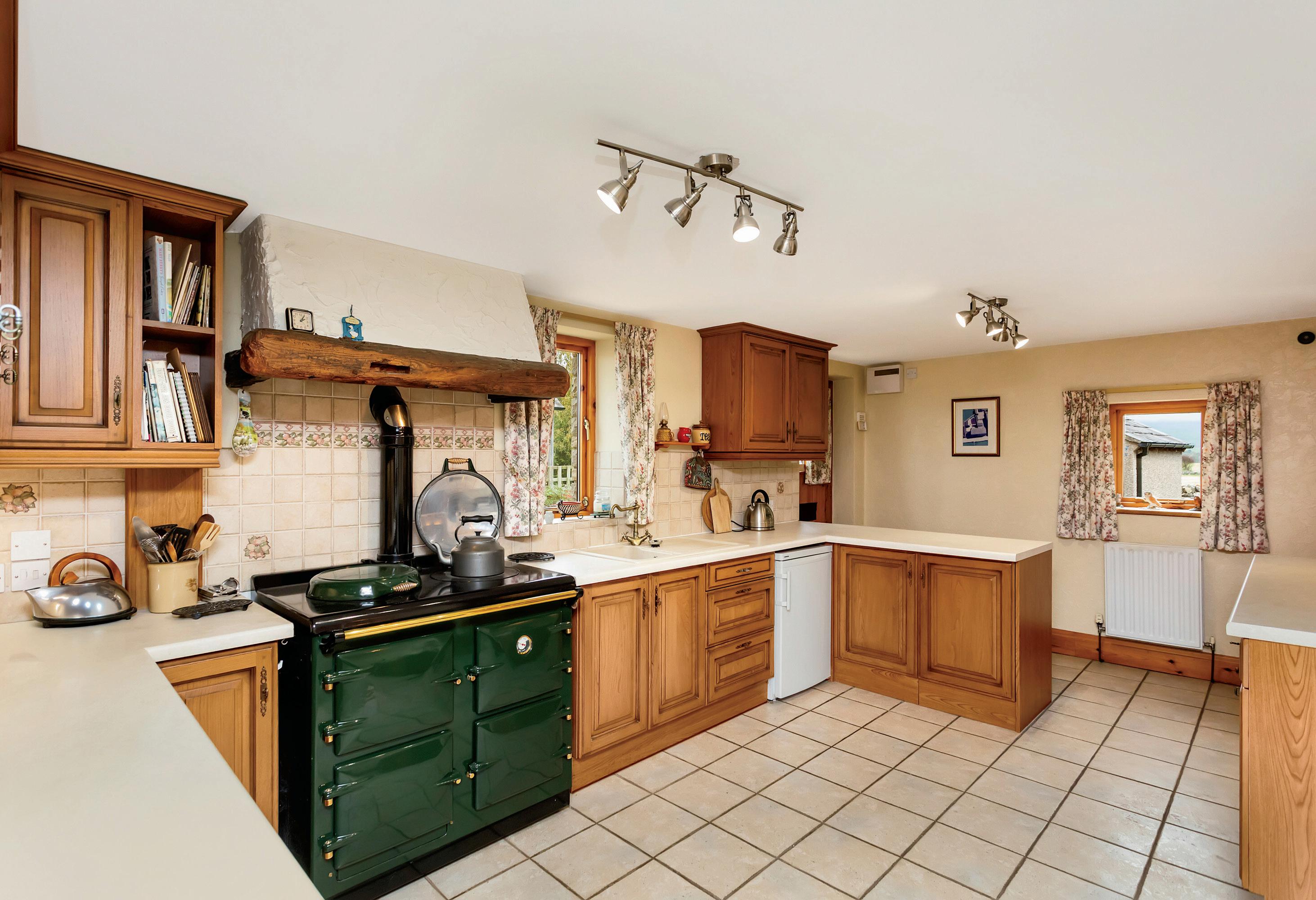 Step through the front door into a generous hallway with oak strip flooring and practical storage including a large cupboard for coats and an additional understairs space. The ground floor living kitchen is the welcoming heart of the home, centred around a traditional range that also powers the central heating. This homely space is ideal for relaxed family dining and everyday living.