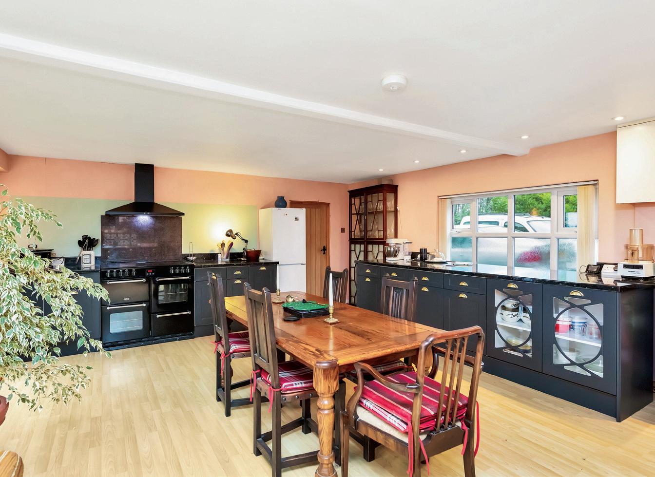 Arrive at the porch and walk through into an entrance hall with handy cloakroom having a two-piece suite. Bright, welcoming and spacious, the dining kitchen is a great space for family life and also entertaining friends. There are extensive cabinets and extra deep worktops, two sets of French doors open to the garden with super views across to distant fields. Off the kitchen is a tank room which houses the pressurized water storage tank, solar equipment connected to the 10kW solar array. The integral double garage has a remote controlled roller door and has been subdivided and insulated internally to provide two store rooms.