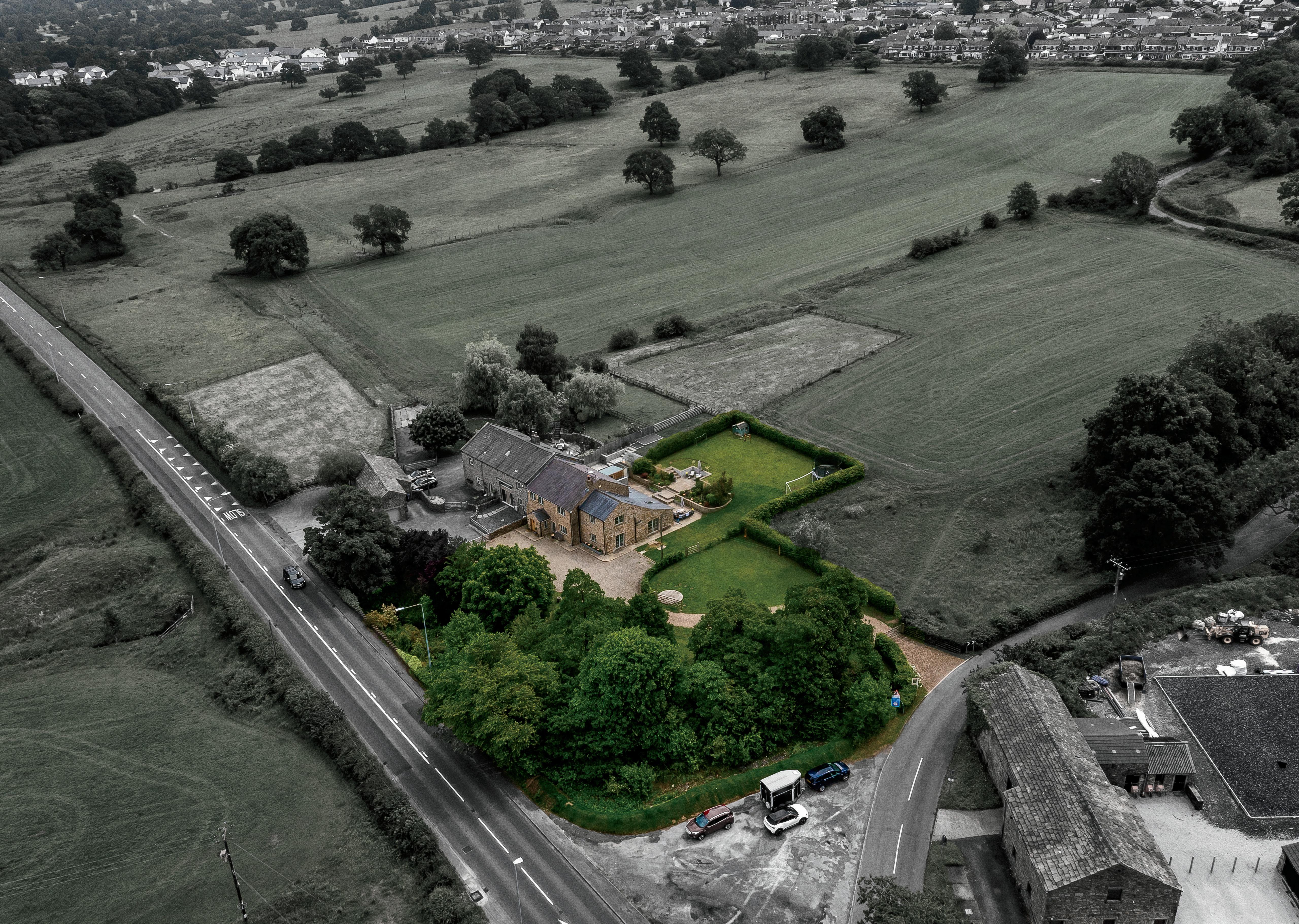 Externally, the home is approached via both Longsight Road and a private drive off Whitehalgh Lane. A large gravelled forecourt provides ample parking, while to the rear, the gardens unfold in stages - lawn, patio, and secluded entertaining areas surrounded by natural beauty and thoughtfully curated planting. An enclosed yard and adjoining sheds offer useful additional storage and workspace.