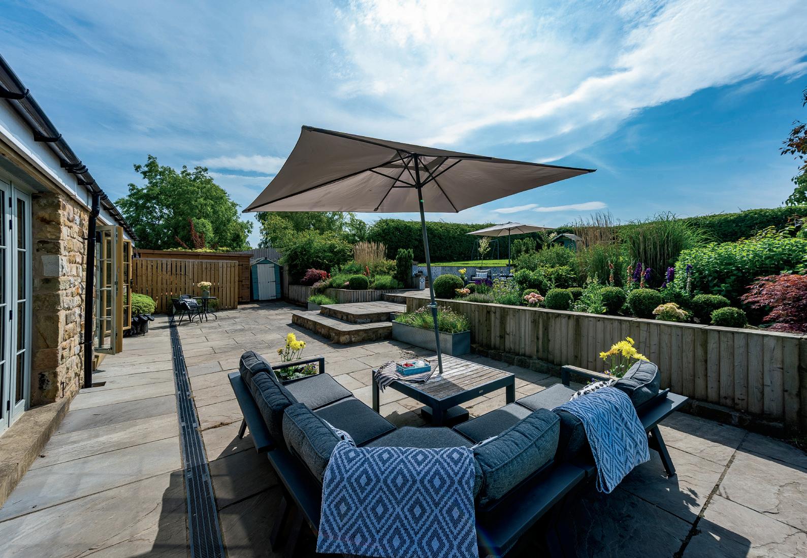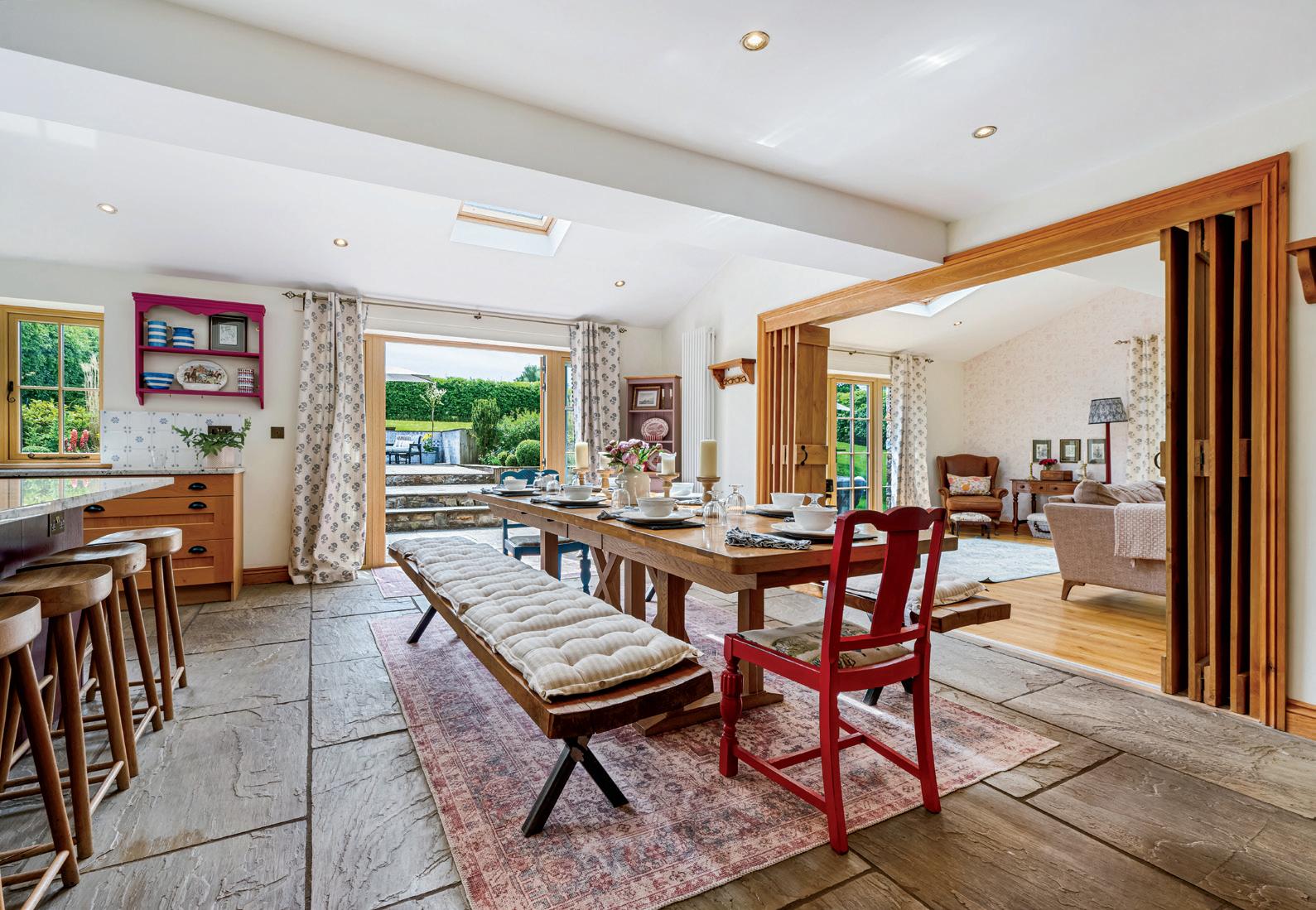 At its heart lies an expansive open-plan kitchen and dining area - a natural gathering space framed by bespoke oak cabinetry, granite worktops, and a striking central island. Sliding doors open directly onto a tiered stone terrace, perfectly designed for alfresco dining, with views across landscaped gardens and mature borders. Beyond there is a gently flowing brook, together with lawns, woodland, and established planting.